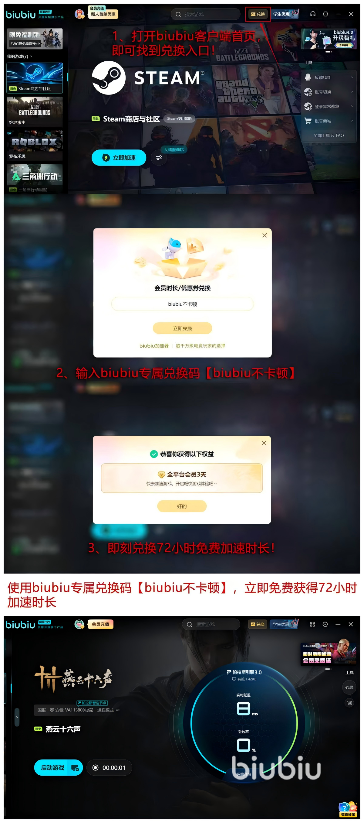 【biubiu不卡顿】72小时轻松获取,新用户可以领取24小时的时间,总共能得到96小时的加速时间,这个对于想要加速福利的各位来说可以说是非常的好用了,很多用户都因此对这款软件由陌生成为忠实的用户,当然限免一定是不能少的福利,加入轮换之后一定是会对大家有好处的。