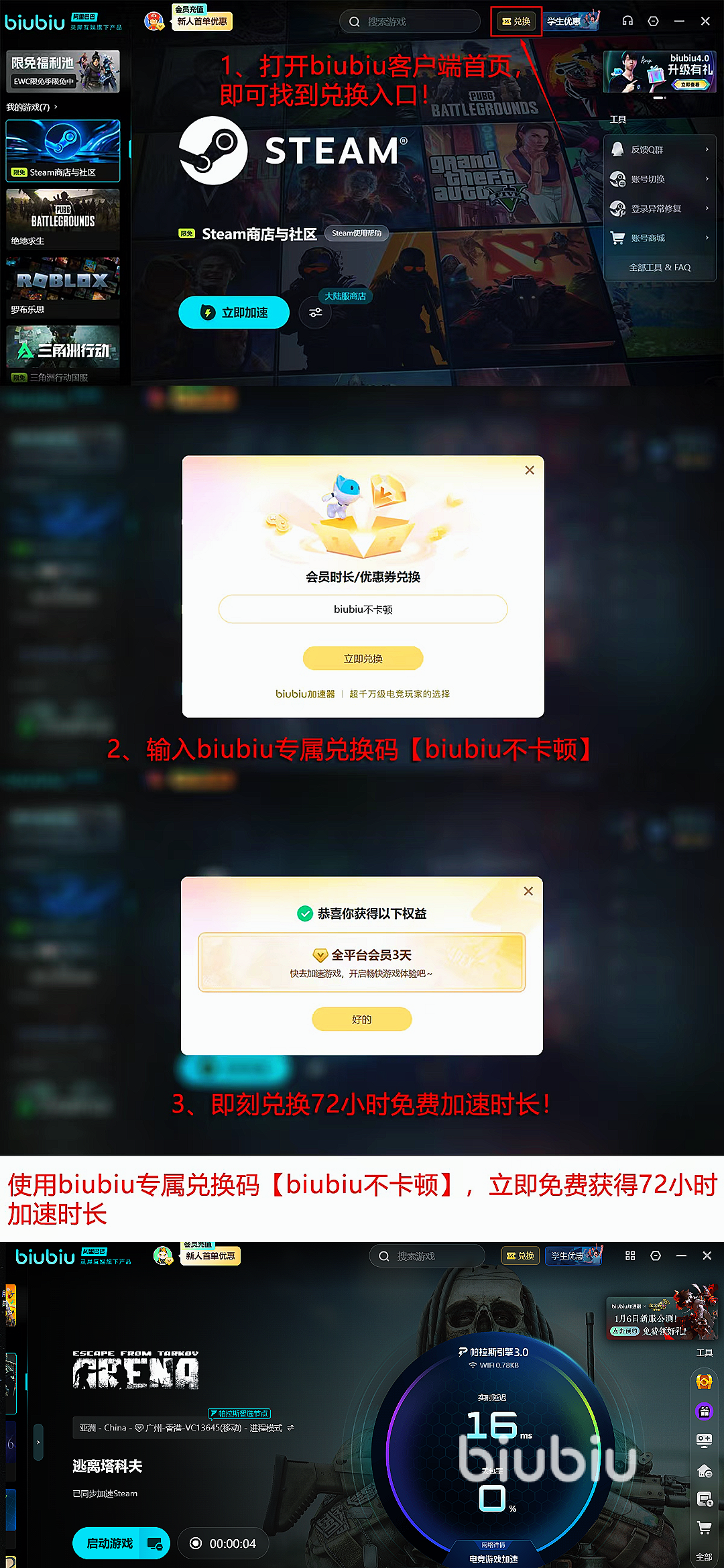 而且biubiu对于新用户还是挺好的,只要是新用户注册就能直接解锁24 小时全场游戏免费加速特权,输入兑换码【biubiu 不卡顿】就能额外再领 3 天免费加速时长,共计可以获得96小时,兑换码福利老用户也是能享受的。