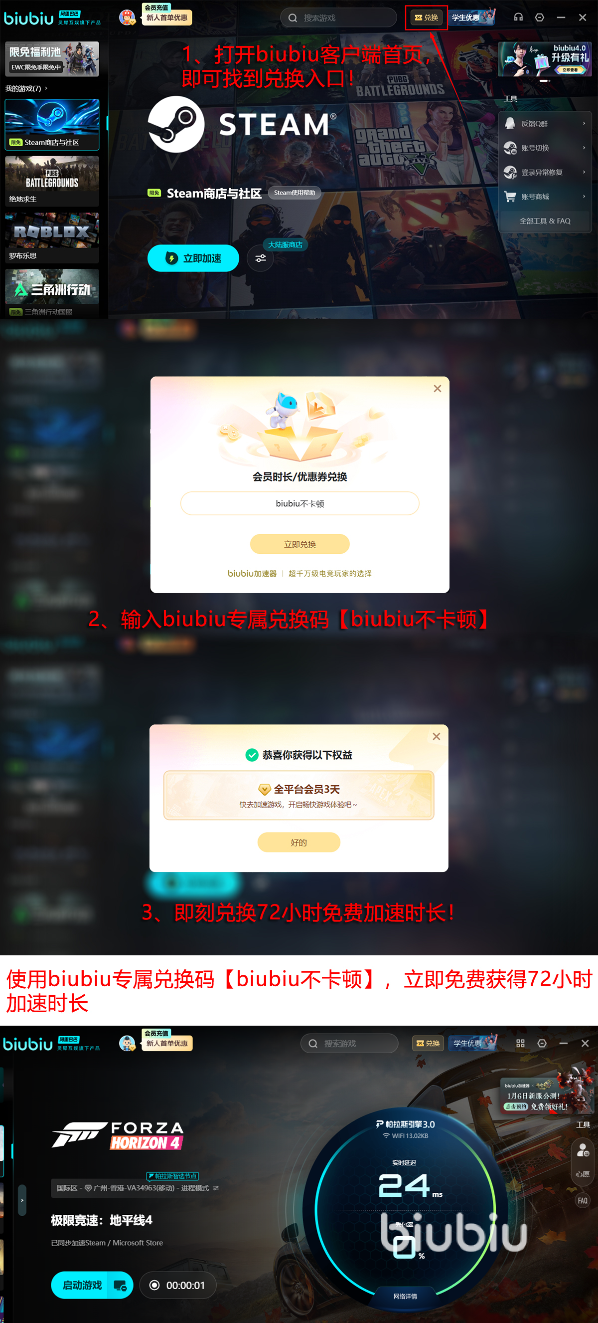 部分玩家想先看看能不能稳定作战,此刻新人可先注册,就能领取24H的免费加速;用了后自然发现没问题了,接着还想继续玩更长时间。那就可通过兑换码【biubiu不卡顿】,额外领取三天免费加速,新老用户均可使用一次。完事后,就可继续参战啦!