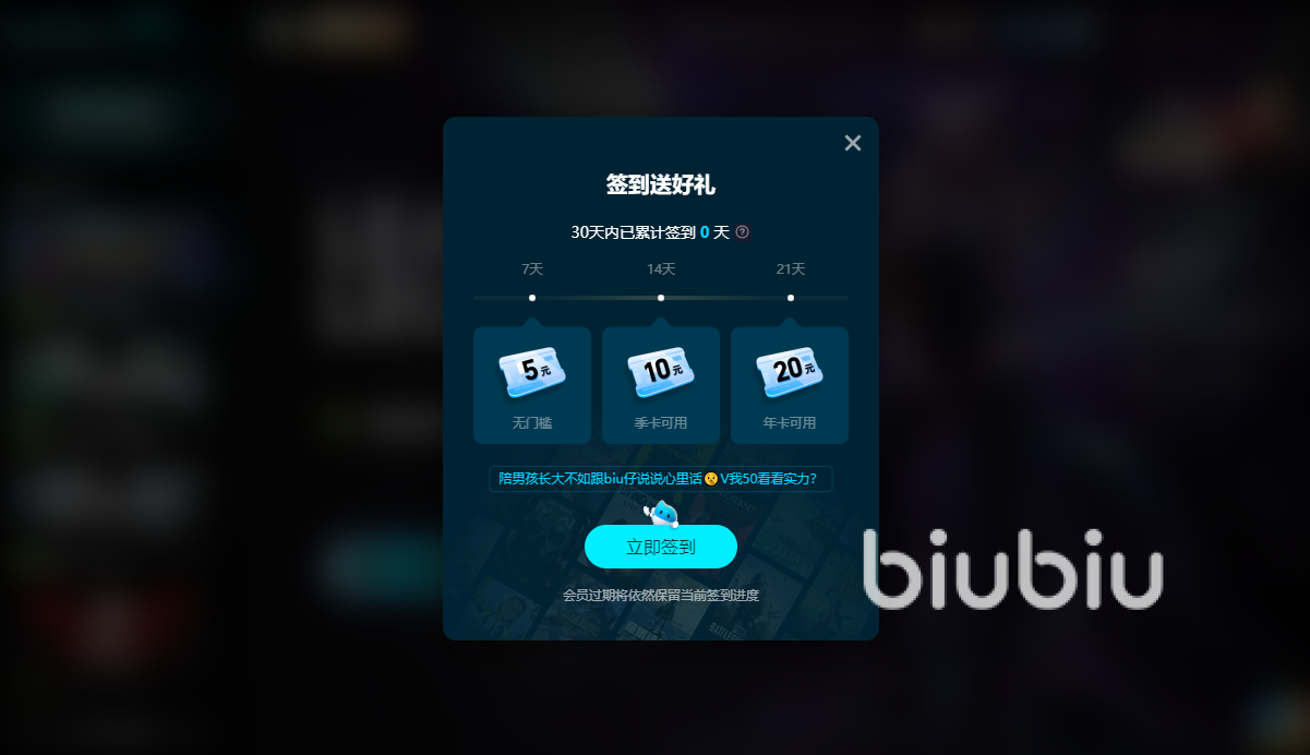 加速器收费已成为大势所趋,很多免费的基本上功能不齐全,而且加速要排队,很多时候满足不了各位的多方位全时间的需求,也就渐渐退出了历史的舞台,好在大家有biubiu可以使用,有着超级强大的降低延迟和降低丢包的能力,这些能力单拿出来看着都不是很起眼,但是组合起来就是惊天动地的强大,能够多维度多次元的提升大家的整体体验,当然很多的时候增幅的力度也是非常的大,长期固定的签到活动大家一定要准时签到,即使会员过期依然会保留签到的记录,这对于所以人都是直接的福利。