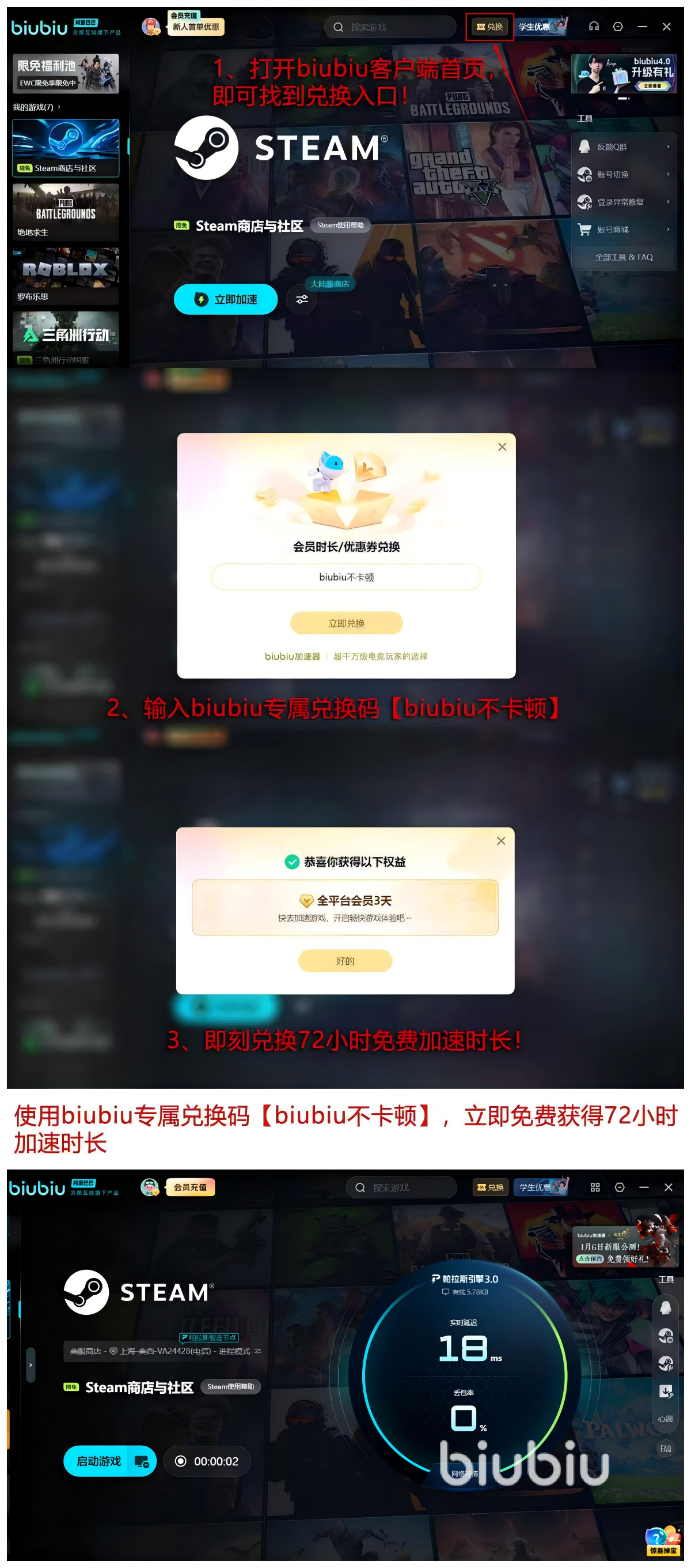 【biubiu不卡顿】口令72小时可以随意获取,可以累计新人用户的24小时,总计能够获得96小时的加速时间,折算一下有四天的时间,非常的有用,面向各位有需求的各位非常的好用,总计超长的福利为大家带来了无与伦比的体验。