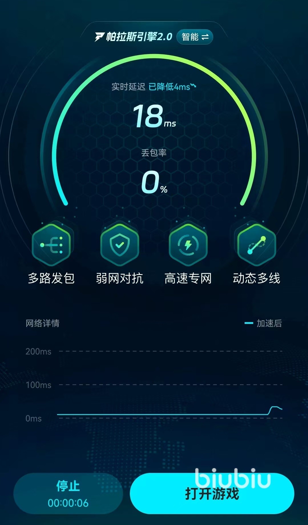 之所以推荐大家使用biubiu,是因为biubiu是现在行业内综合性能排名第一的软件,在多平台都有应用,在移动端更是做到了免费加速手游,每天只需要看几个广告,就能够足够一天的加速使用。在技术方面,biubiu可以动态选择出最优的节点进行连接,还能够在移动信号和WiFi之间不断进行切换,这样自动找到最合适的连接方式。能够有效降低延迟和降低丢包率,即使当前的网络波动比较大,也可以稳定在安全范围之内。