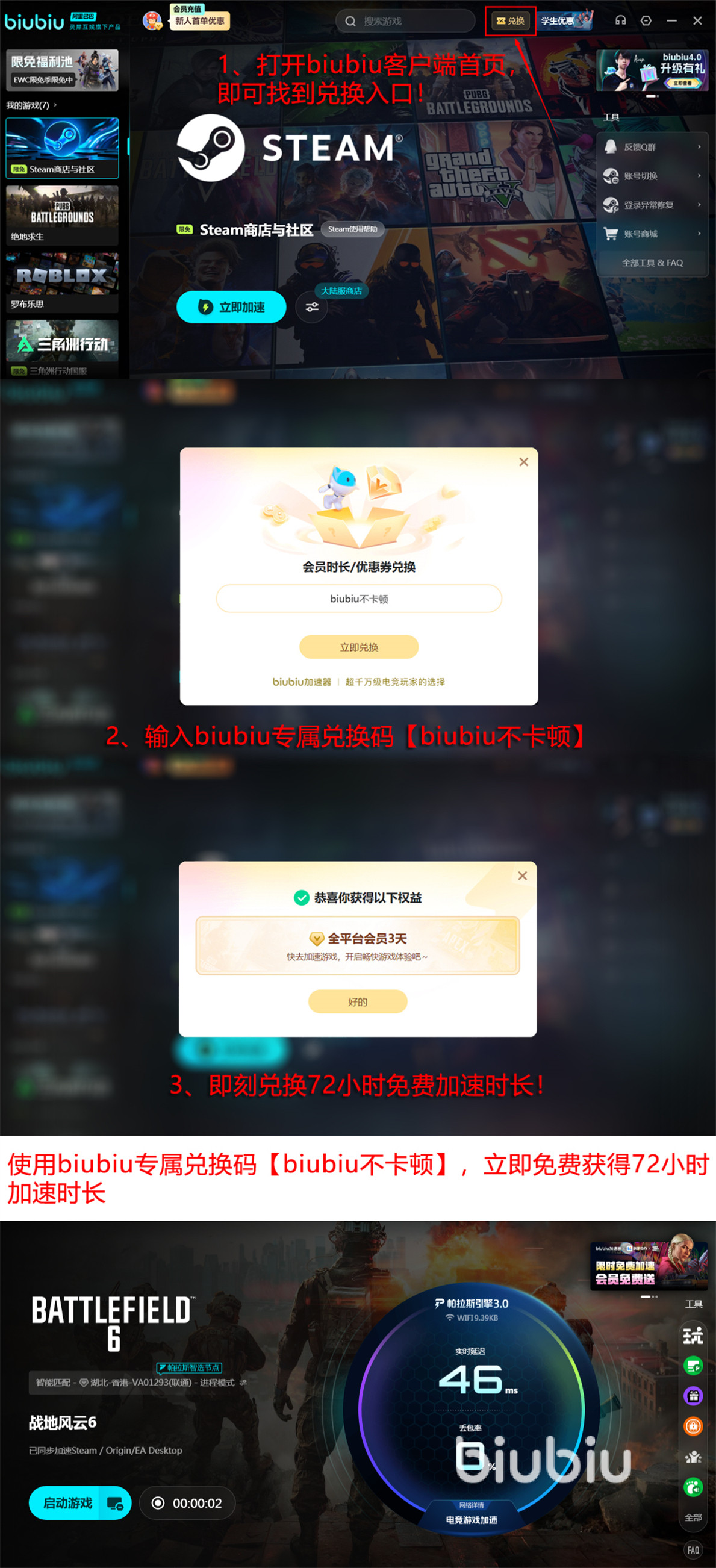 为了能够让更多的用户都体验到biubiu的加速功能,现在特意推出了新注册账号就能免费加速24小时的福利,这样新人就可以先不用着急充值,免费试用一下再做出决定。还推出了一个每个号都可以用一次的兑换码【biubiu不卡顿】,能够换取72小时加速时间。这样新号两项福利都可以享受到,累计96小时的免费加速时长。