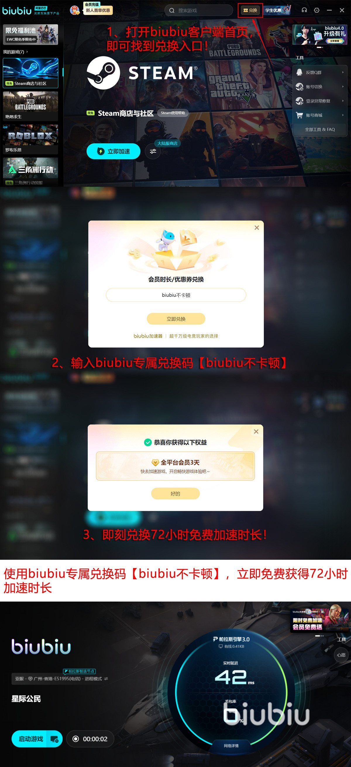 市面上普遍加速器还有一大痛点就是价格比较昂贵,而biubiu加速器让用户体验门槛变得非常之低,新用户首次来注册登录就能够解锁24小时的免费加速时长,后面新老用户再输入兑换码【biubiu不卡顿】还能再领取72小时的加速,光是这两项福利加起来就能够得到96小时的免费加速体验,这样用起来一点负担都没有。