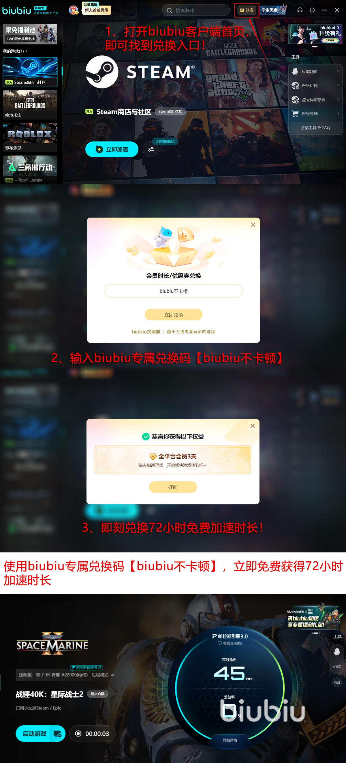 加速器无论再怎么好用,都需要解决问题,biubiu也是诚挚邀请新用户来注册体验,首次注册就能得到24小时免费加速权限,让你实现无门槛也能感受到黑科技加速的强大之处,后续再输入专属的兑换码【biubiu不卡顿】还能领取72小时,这个福利兑换码对老用户一样也是生效的,只不过新用户加起来一共是有96小时的体验体验时间。