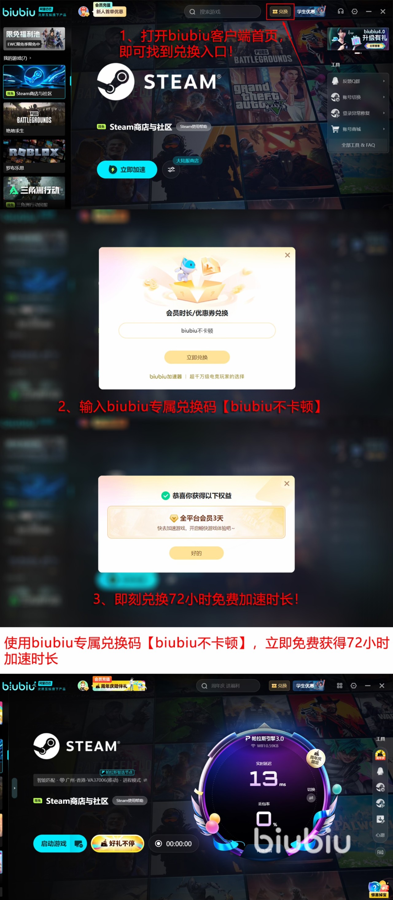 而且现在正值活动期间,新用户注册登录就可以立即享受24小时免费加速的福利,还可以和一直支持biubiu的老用户们一同享受【biubiu不卡顿】兑换码换3天加速时间的优惠政策,大学生认证还有更多优惠。