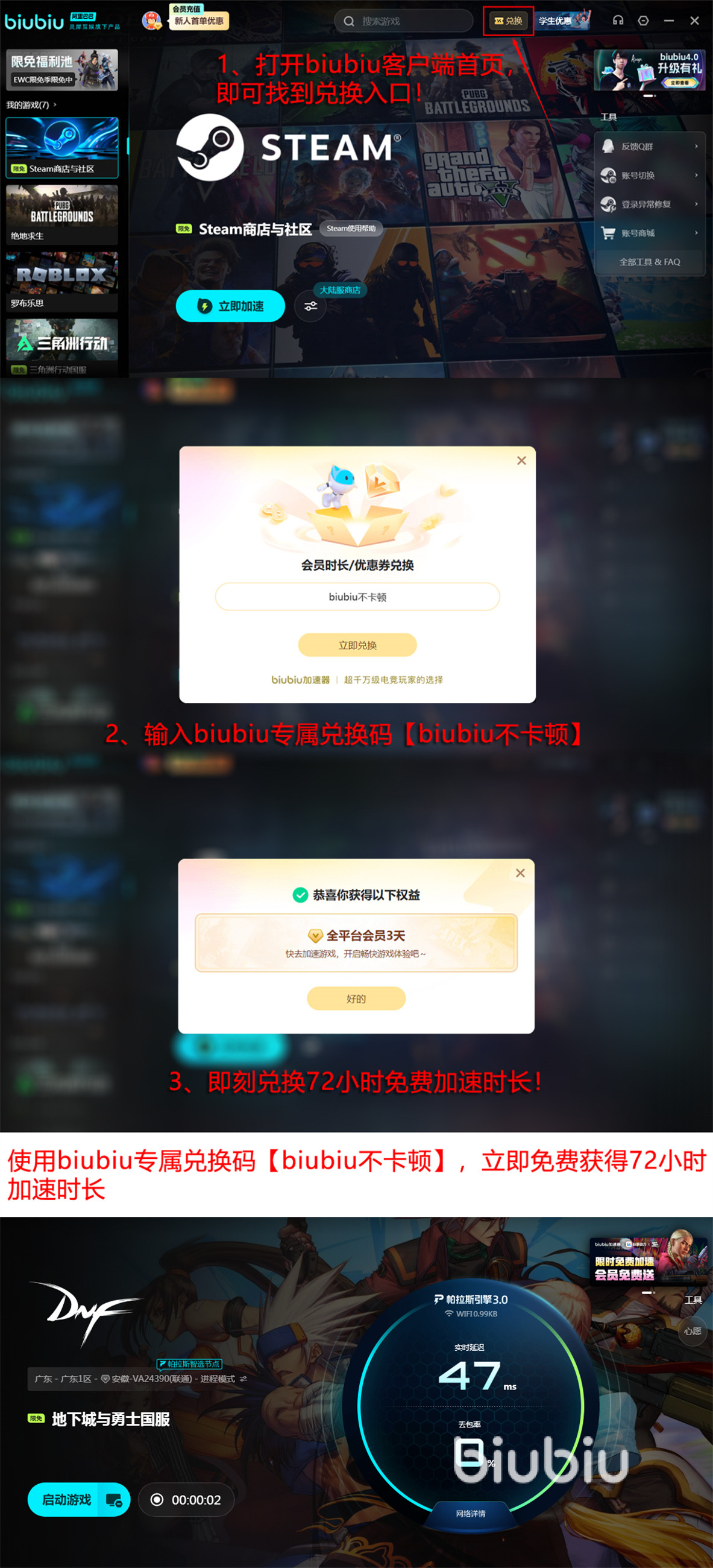 想要体验一下biubiu的真实性能,现在只需要注册一个新账号,然后就能免费加速24小时,这样做到了注册之后直接就能使用。还可以通过输入一个兑换码【biubiu不卡顿】兑换72小时加速时间,这样就有96小时免费加速时长。兑换码其他老账号也可以使用,所以老玩家也欢迎回归。再加上biubiu免费提供了游戏攻略和社区等相关服务,成为一款真正适合游戏玩家选择的工具,全方位解决各种问题。