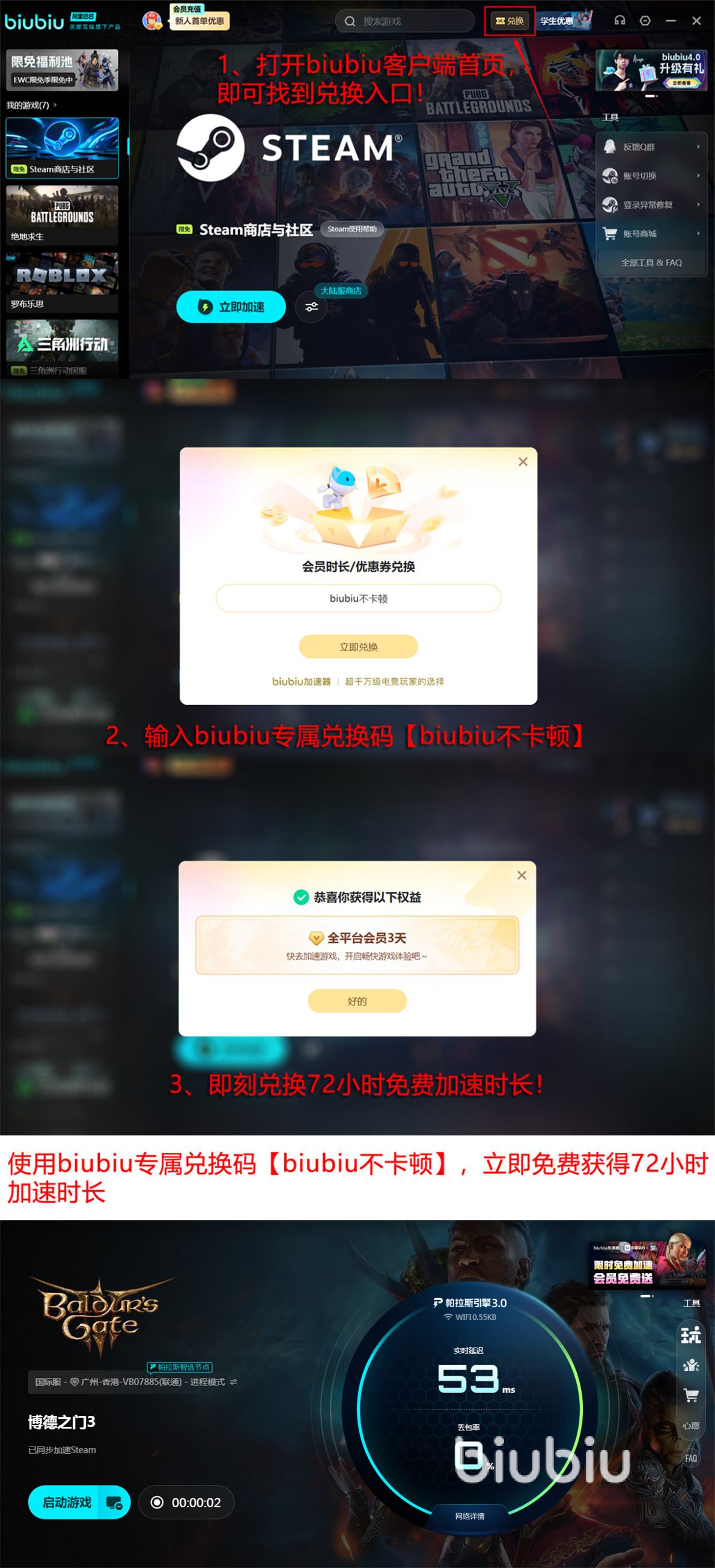 看清楚了biubiu的一系列技术方面的优势之后,接下来就可以注册一个新号开始体验了。新注册号能免费加速24小时,这是长期的一项新人福利。每个号都可以通过兑换码【biubiu不卡顿】得到72小时加速时间。所以现在对新人非常友好,总计96小时的免费加速时长,已经足够体验真实效果了。