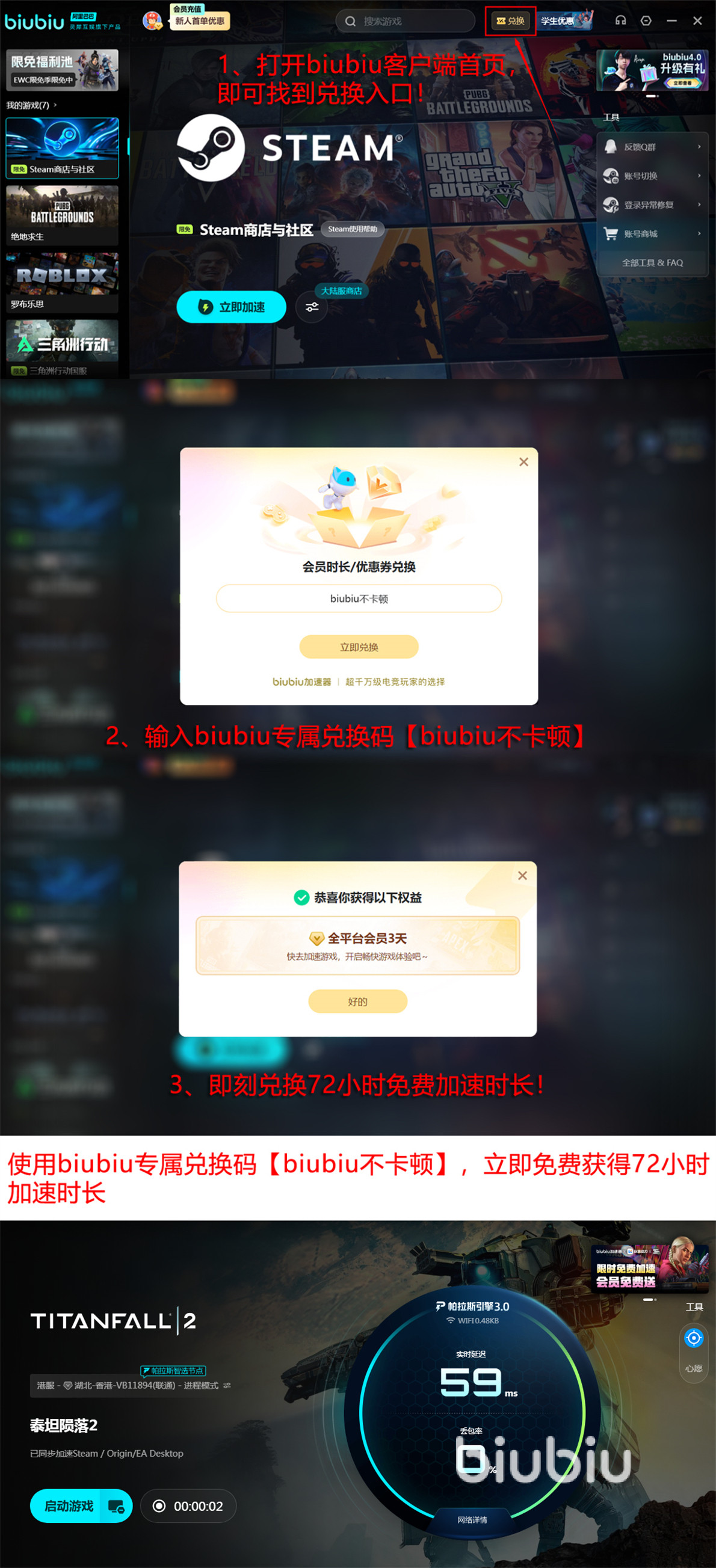 福利方面优势就在于为新注册账号提供了超长的免费试用时间,例如新注册的号可以立即免费加速24小时,还有可通过兑换码【biubiu不卡顿】兑换得到72小时加速时间,这样就有96小时的免费加速时长,非常充裕。而且这个兑换码每个号都可以用一次,之前已经注册过的号也可以使用。除此之外,biubiu还免费提供了海量游戏攻略,打造了一个人气很高的社区,这些都是和游戏相关的服务,随时都能免费体验到。