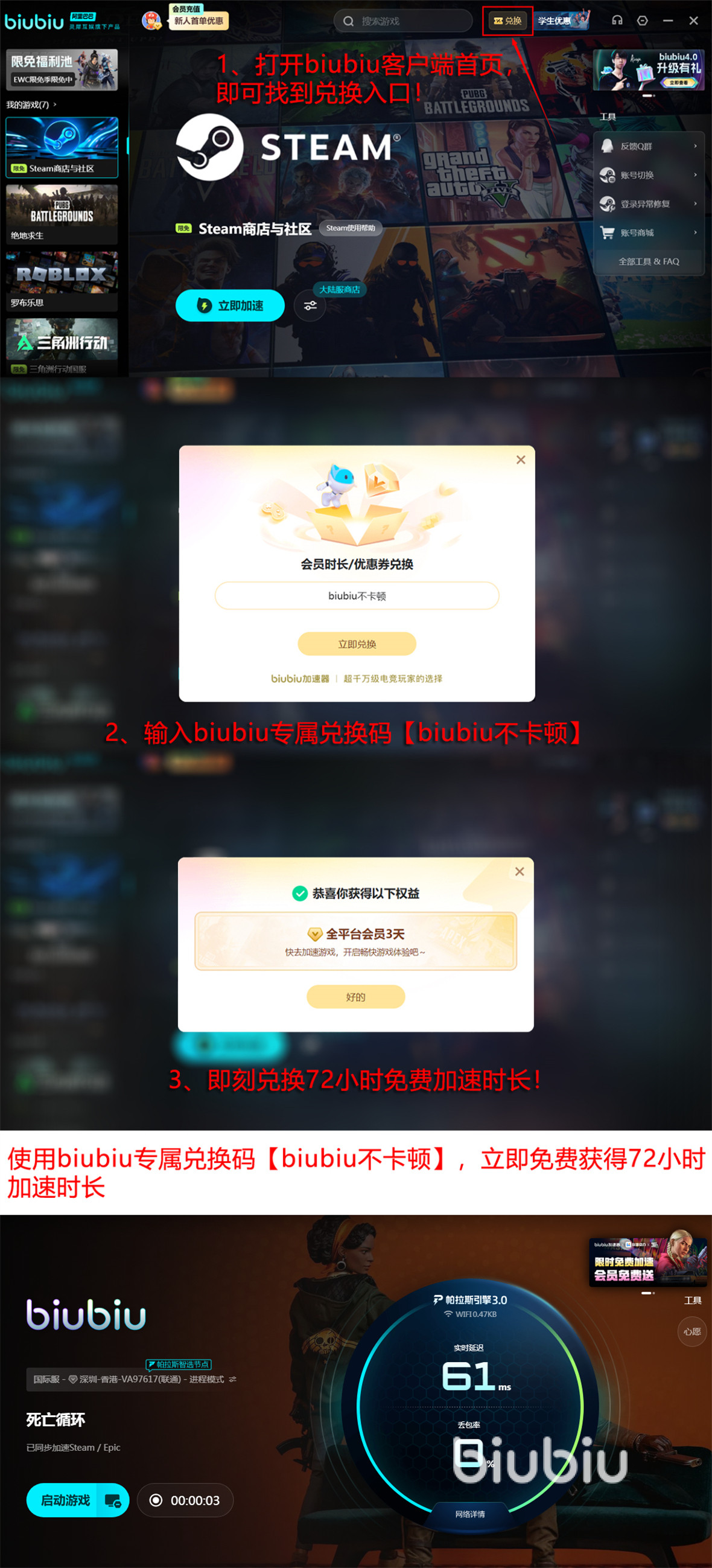 如果让大家一开始就充值续费可能会心存疑虑,所以推出了新注册账号免费加速24小时的福利,任何一个刚刚注册的新号都能享受到。还可以通过加兑换码【biubiu不卡顿】得到72小时加速时间。这样就有96小时的新人福利能领取到,非常划算。兑换码其他老号也可以使用一次,大家都不要错过。