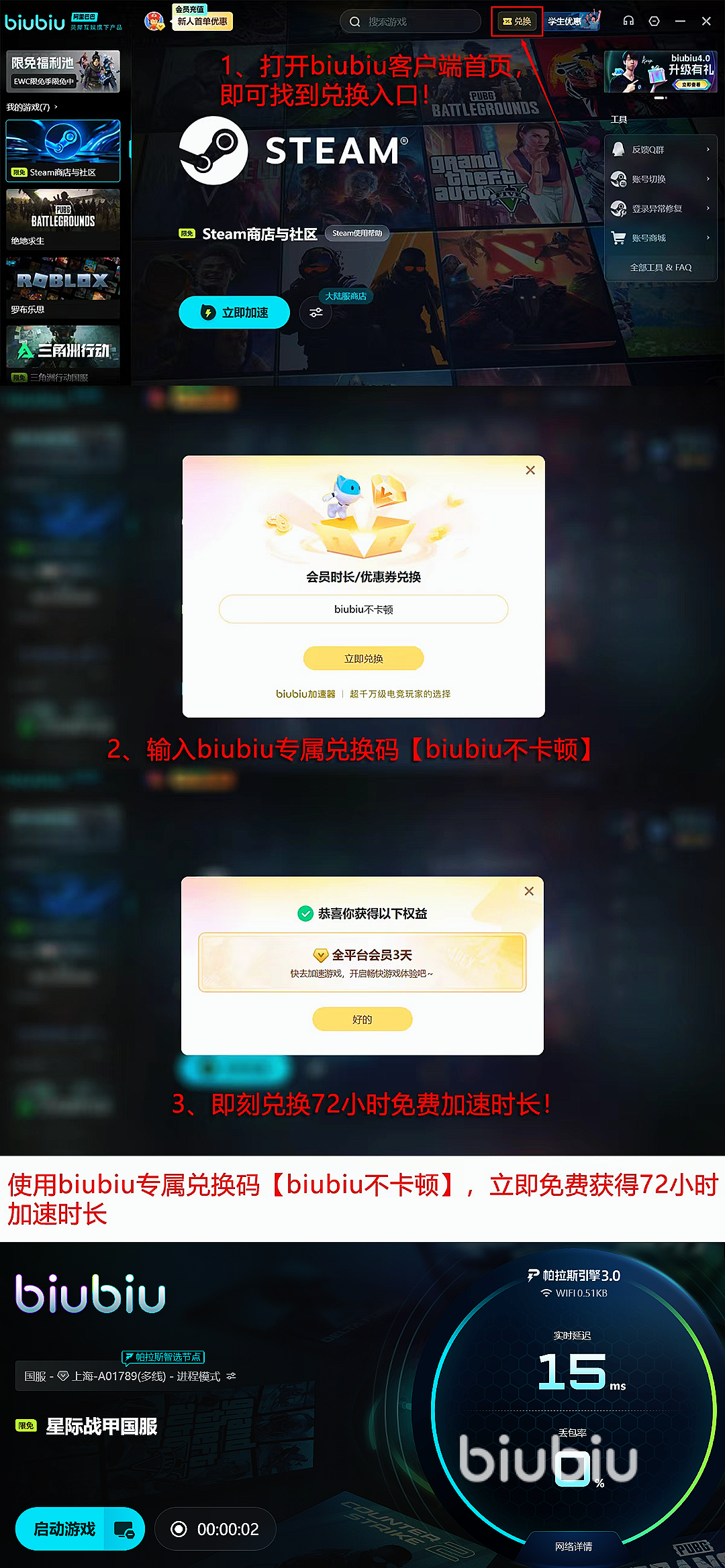升级的不仅仅是性能,服务方面也是给到位了,只要是新用户注册biubiu都可以获得24小时免费加速,加速期间什么路线都可以选择,同时使用兑换码【biubiu不卡顿】可获3天免费的使用权哦,共计可以获得96小时的时间,老用户也是能完全享受的。