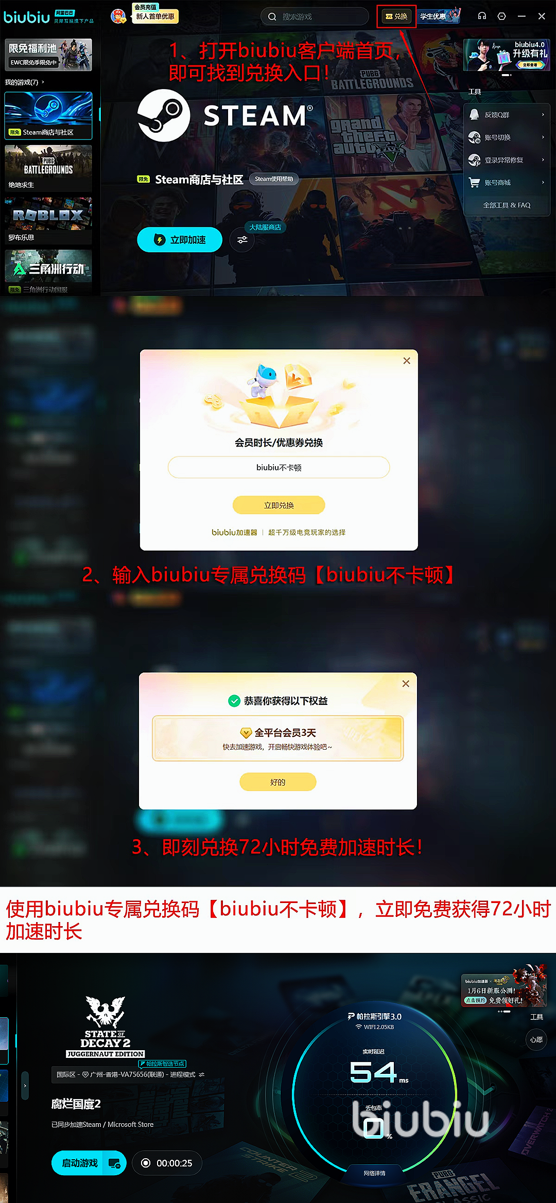 而且biubiu除了提高自身的加速性能以外,对于所有用户都是提供额外优惠的,比如说新用户注册biubiu都可以获得24小时免费加速,加速期间任意游戏均可以选择,使用兑换码【biubiu不卡顿】可获3天免费的使用权哦,也就是可以获得96小时的时间,这个福利对于老用户也是完全免费享用的。