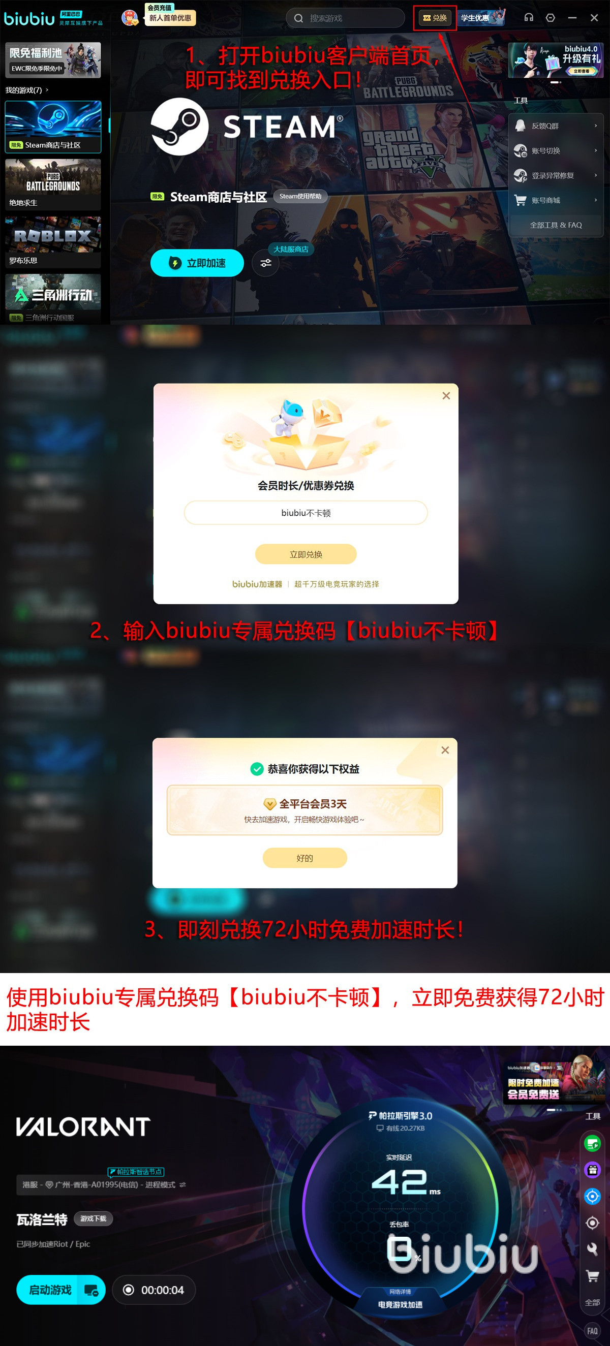 为了能让更多人有同款电竞体验,biubiu加速器直接降低了体验的门槛,要是第一次来注册的话,能无门槛、无任务领取到24小时免费加速,后面再输入一个老用户也能使用的兑换码【biubiu不卡顿】再激活72小时加速时长,所以对新同学来说一共是96小时的加速。