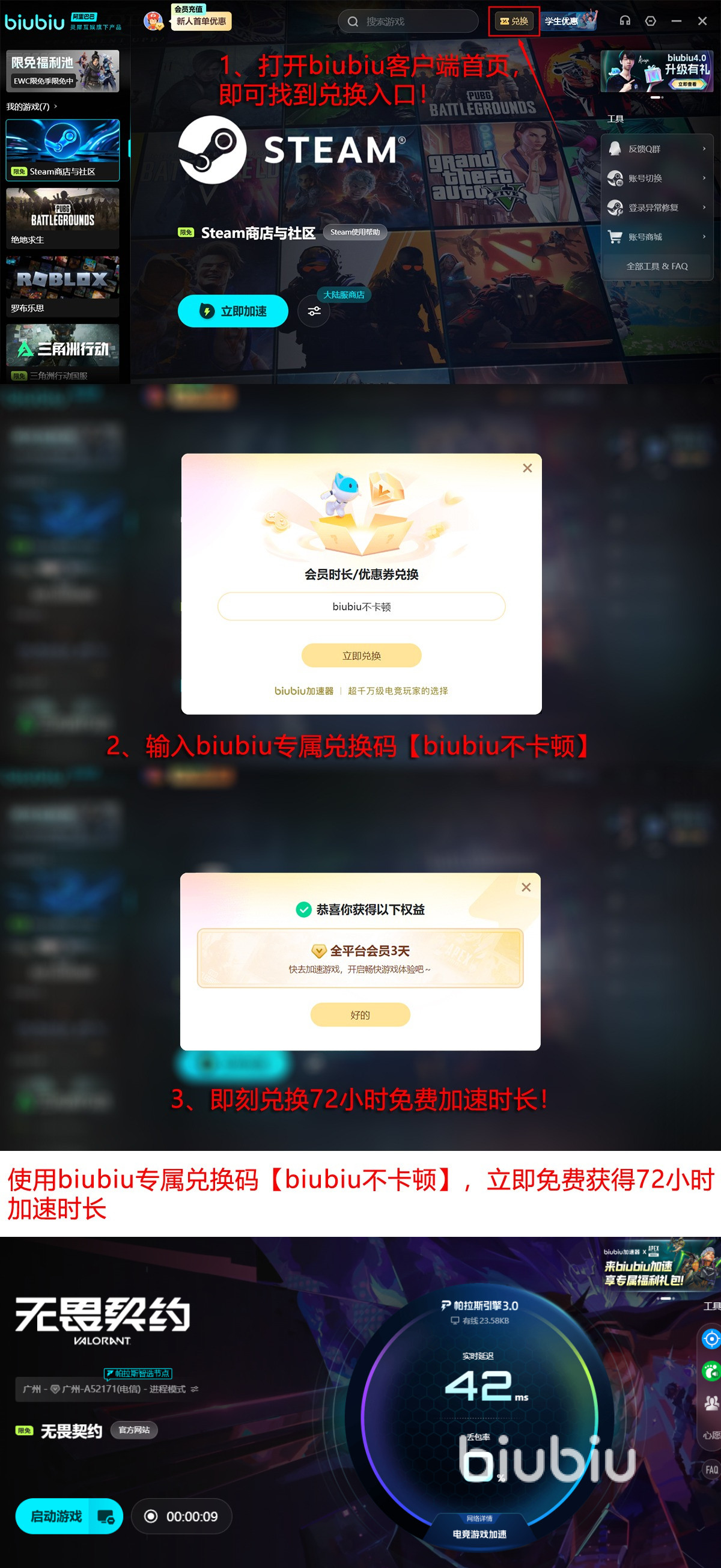 为了能让更多同学体验到这种电竞级别体验,biubiu对新用户还开放了各种福利,第一次注册登录能领到24小时免费加速,后面从首页输入兑换码【biubiu不卡顿】还能再领72小时,哪怕你不是新用户一样也能通过兑换码领取到,对新用户来说这两个福利加在一起就有了96小时的体验。