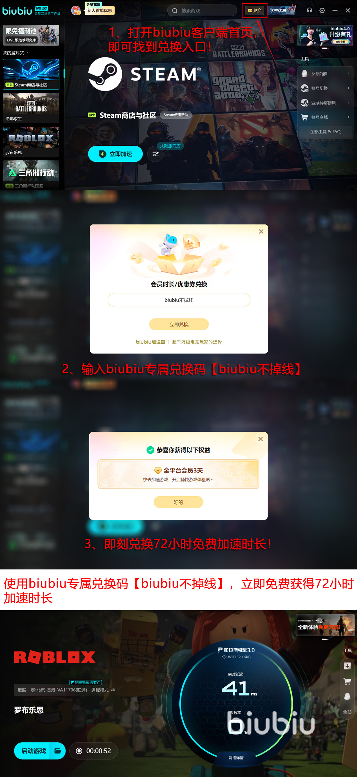 注册完成之后会先拿到24小时的初始试用权限。这时候再输入 【biubiu不掉线】 ,就能额外再领到72小时的时长。这样组合起来,能让咱们一口气体验总共96小时的免费服务。