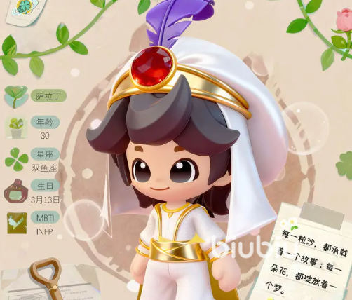 初次对话时,萨拉丁沉稳平和的语调与富有哲思的措辞便给人留下深刻印象。刻于四叶草商店门楣的那句箴言,实为其人生态度的高度凝练。他出生于3月13日,属双鱼座,性格兼具调停者特质与学者气质——言语轻缓却逻辑清晰,表达简练却直抵本质。表面看,他是一位专注植物养护的店主;深层背景则更为丰富:出身阿拉伯皇室,自幼接受顶尖教育体系培养,后赴欧洲完成植物学博士学业,学术履历扎实完整。
