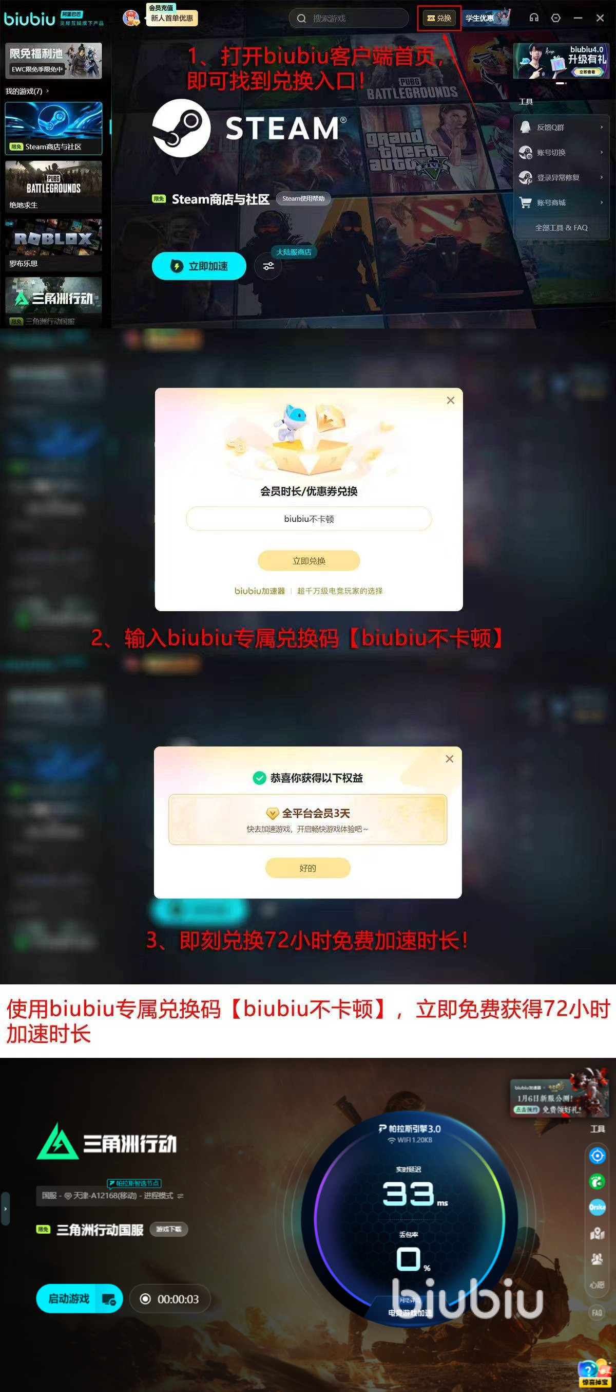 目前平台已上线新人专项支持计划:新用户完成注册后,即可免费获取24小时无时长限制的专属加速权益;输入激活码【biubiu不卡顿】,还可额外解锁72小时极速通道服务,总计96小时全时段稳定加速体验。该方案可切实缓解因网络抖动引发的帧率骤降问题,助力玩家在三角洲大战场中保持操作连贯性与战术决策时效性。