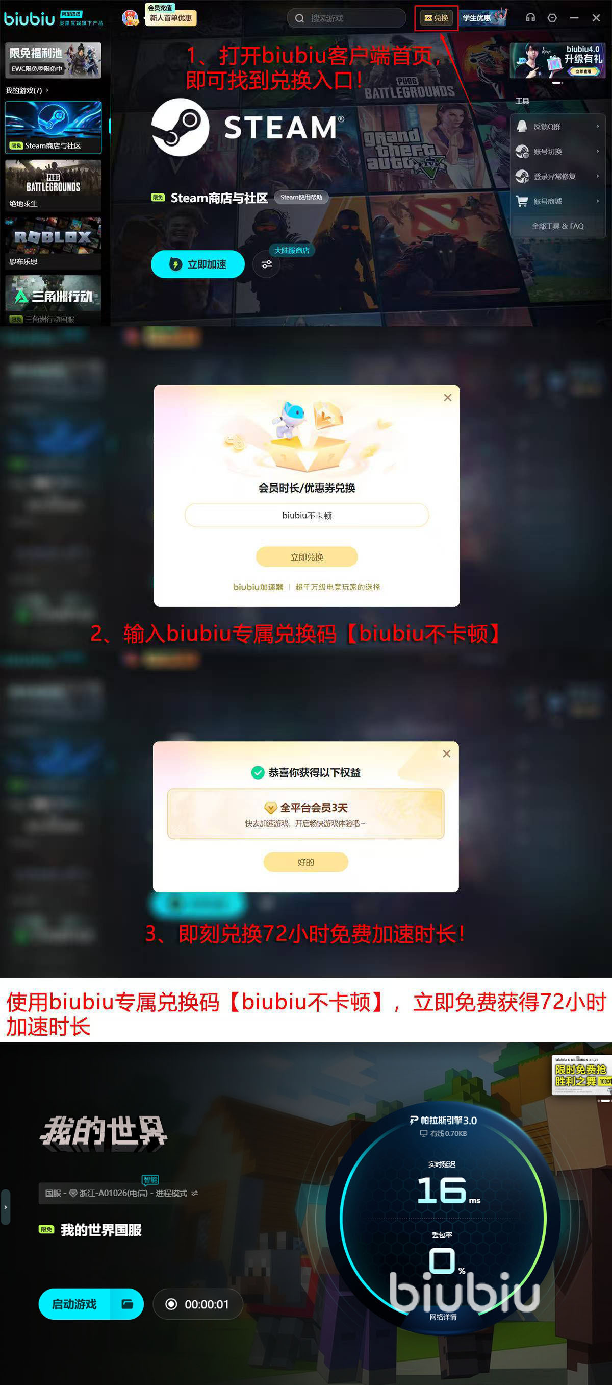 使用biubiu加速后,玩家可明显感知区块加载流畅度提升、红石电路响应延迟降低、多人协作动作同步稳定性增强。当前新用户可享总计96小时免费加速权益:注册即赠24小时,再于客户端首页点击“兑换”,输入口令【biubiu不卡顿】即可叠加72小时,两阶段时长自动累计生效。