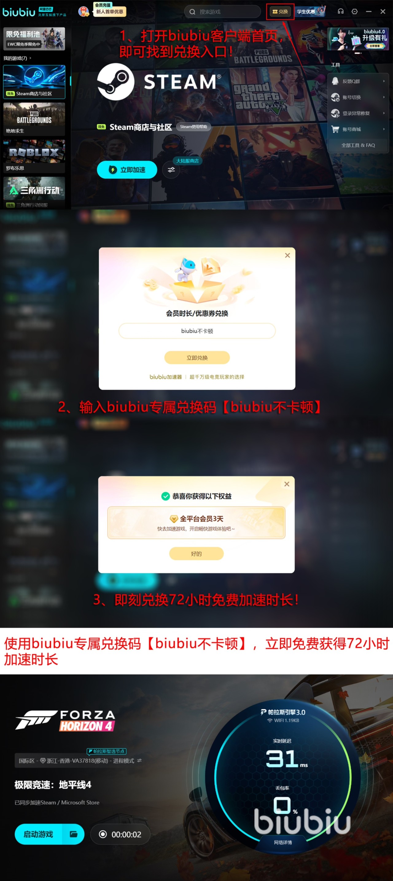 优质加速服务不仅依赖技术参数,更需兼顾用户决策成本。针对试用顾虑,biubiu提供面向新注册用户的24小时全功能免费加速权限,覆盖《极限竞速:地平线4》全部服务器节点。完成首次登录后,输入专属口令“biubiu不卡顿”,即可额外激活3日连续加速服务。该活动面向所有有效账户开放,包括长期未登录的老用户,无需充值或绑定支付方式,真正实现零门槛体验验证。
