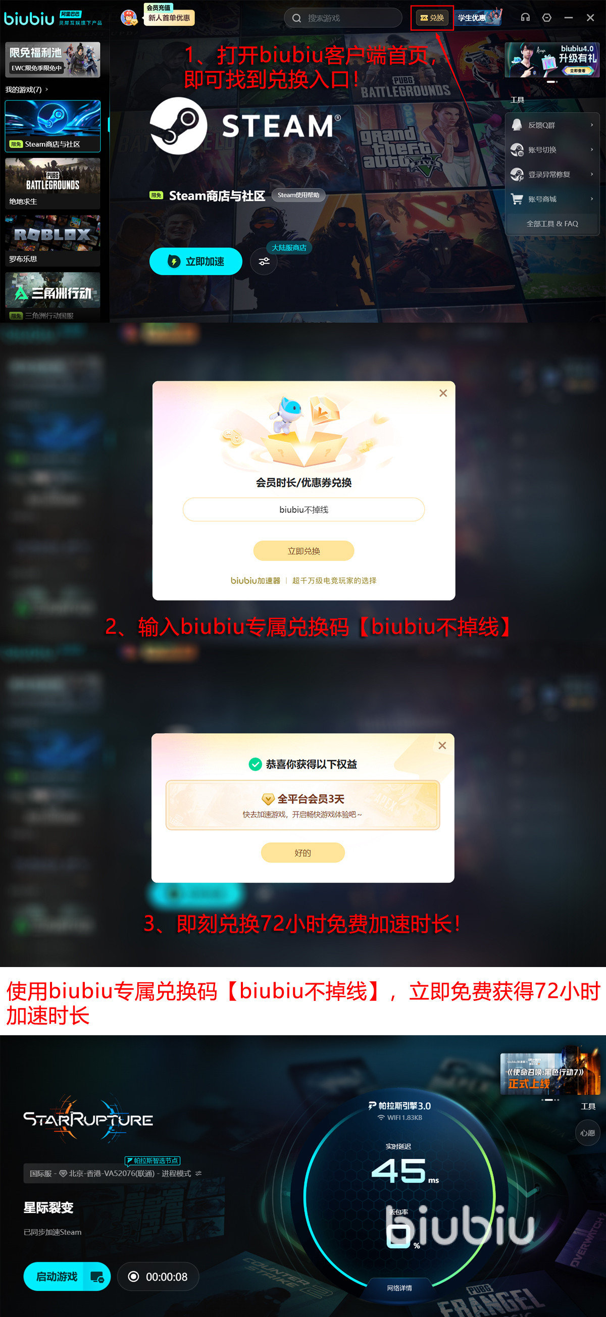 只要是用户,都有可获得福利,新人要注册,会得到免费的24h服务时间用的,然后有兑换口诀在,【biubiu不掉线】给全部用户使用,再得72h,叠加为新人可用96h的。
