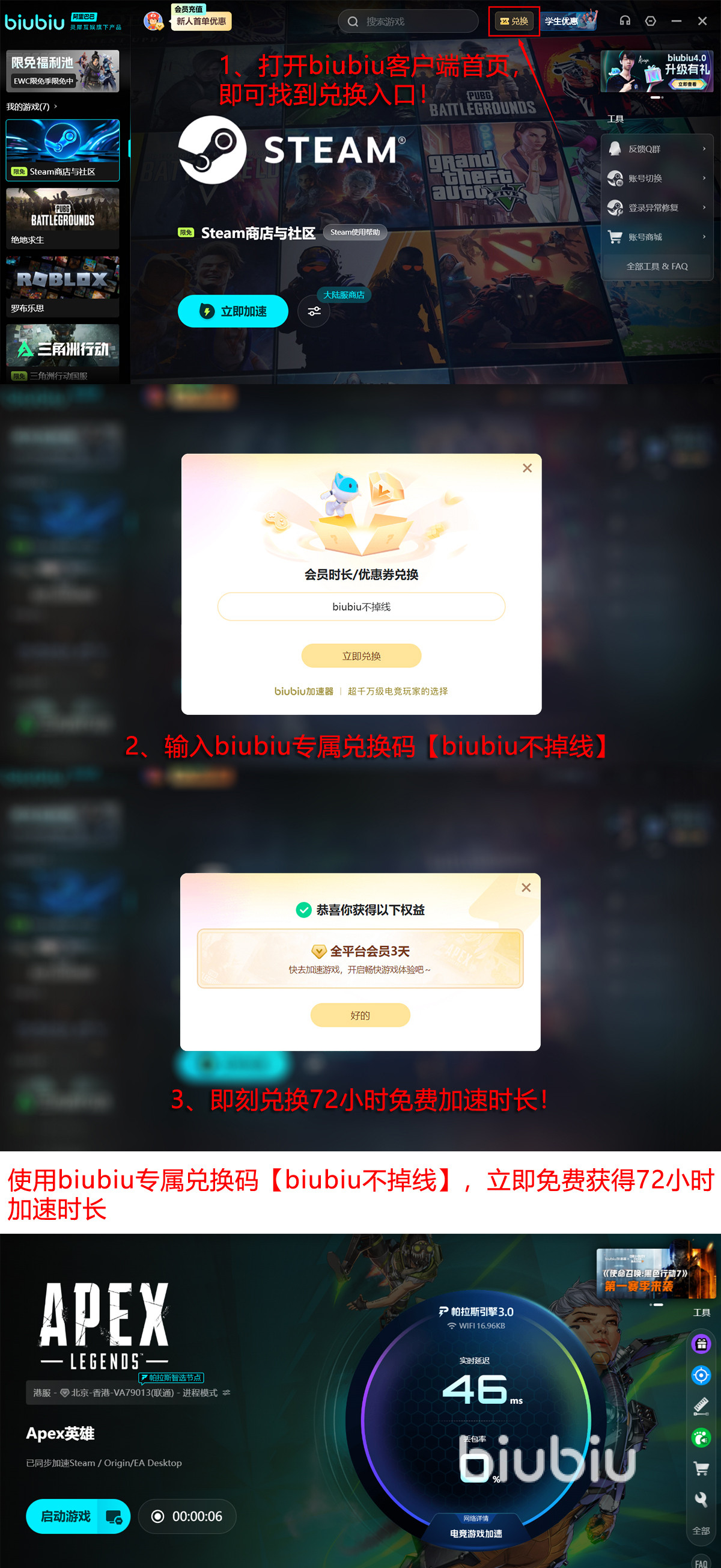 用户完成biubiu平台的注册流程并激活账户之后,即可享受首个自然日内24小时全功能免费试用权益,输入【biubiu不掉线】继续在战场中流畅竞技72小时,这意味着新用户总共可畅享长达96小时的专业级网络优化体验。