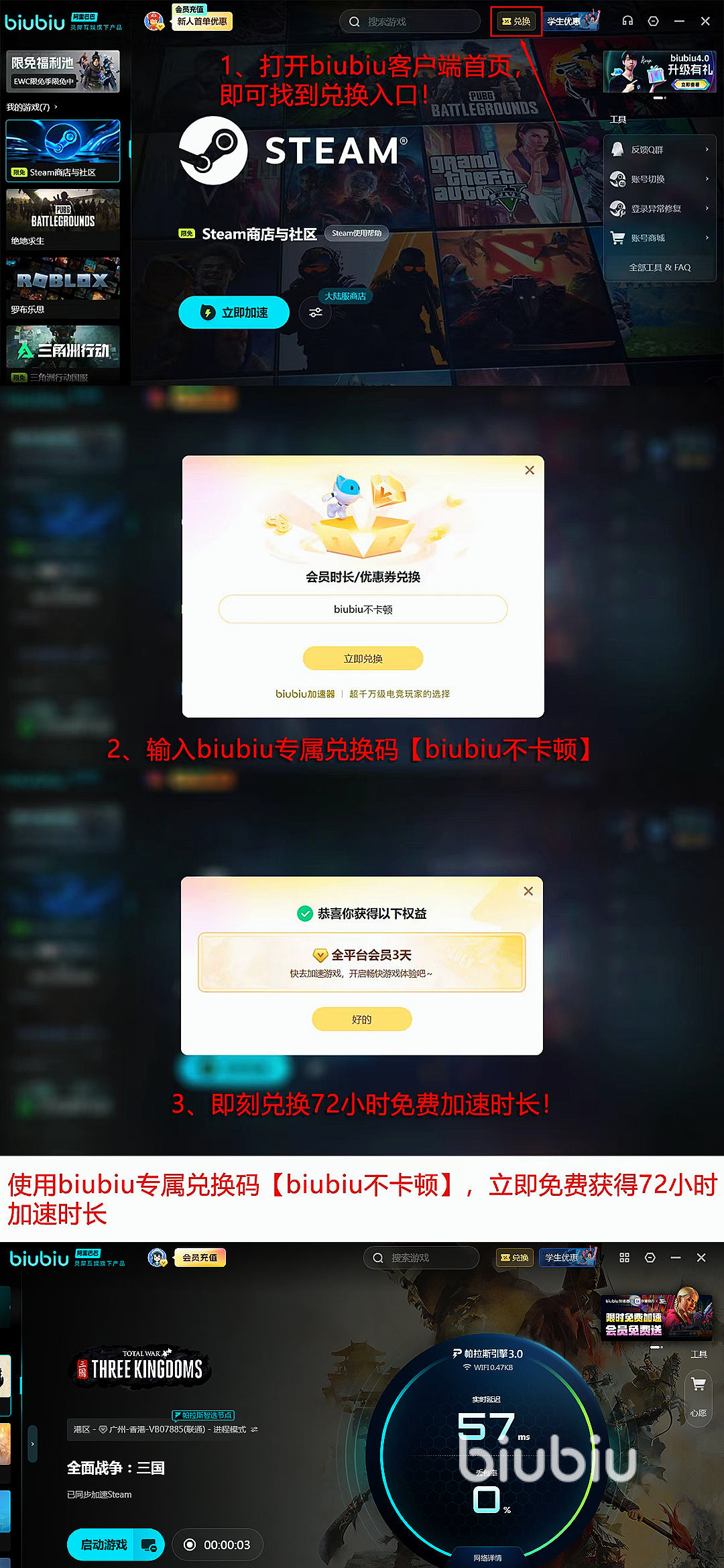 在除了提高能力以外,biubiu也致力于新手用户的体验,只要是biubiu新用户注册就能直接解锁24 小时全场游戏免费加速特权,同时新老用户输入兑换码【biubiu 不卡顿】就能额外再领 3 天免费加速时长。