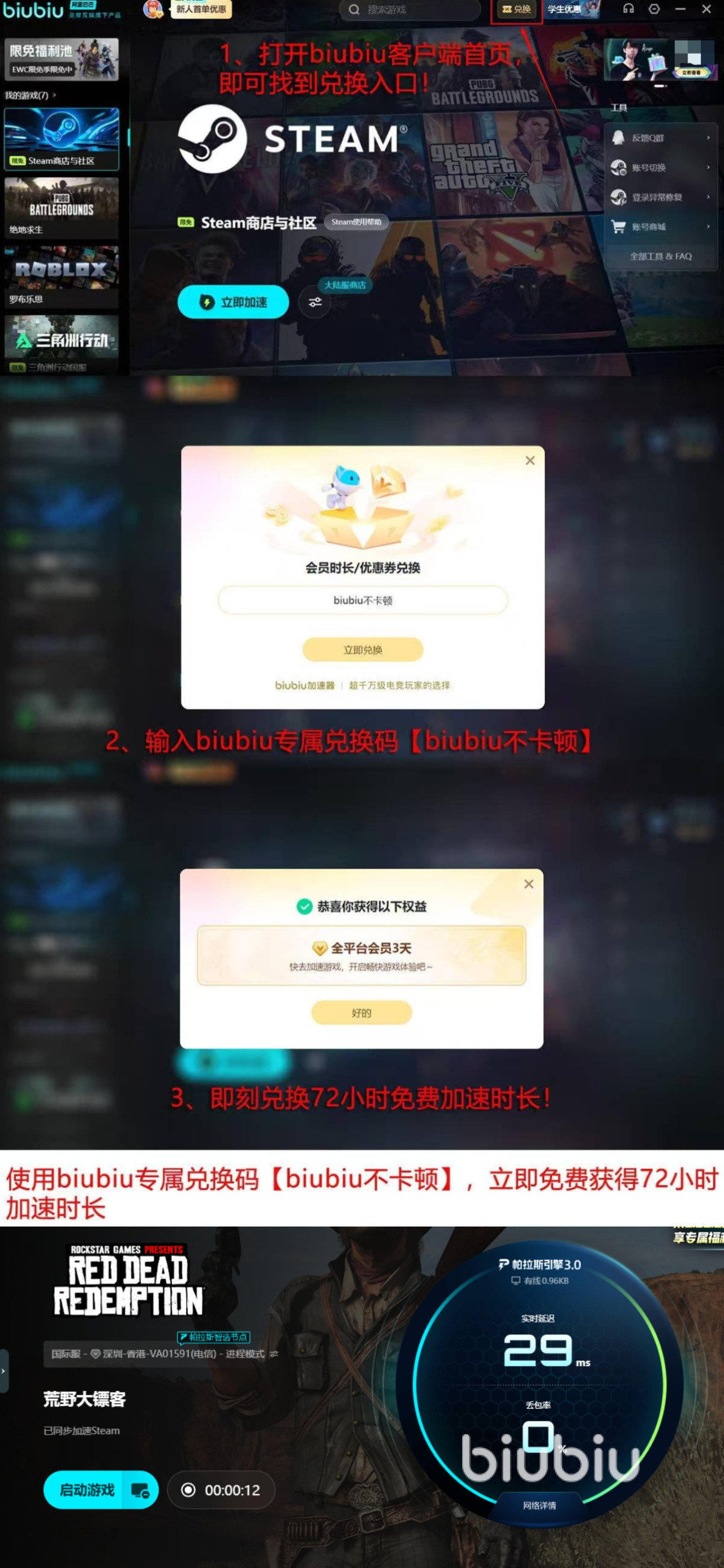 使用上方提供的这款提速工具之后可以有效处理好因为网络波动所导致的一系列掉帧,卡顿,延迟等问题,所以不仅仅是掉帧的情况,各种其他隐藏问题也都是可以帮助大家有效防御的,若是大家觉得不错,心动不如行动,新用户现在下载还可以享受到不少的好处,比如直接可以得到一整天免费试用提速的机会,若是各位觉得效果还不错的话,那么还可以享受平台给所有人带来的三天体验时长,大家只需要在客户端界面找到兑换入口,点击输入【biubiu不卡顿】就可以快速享受了。