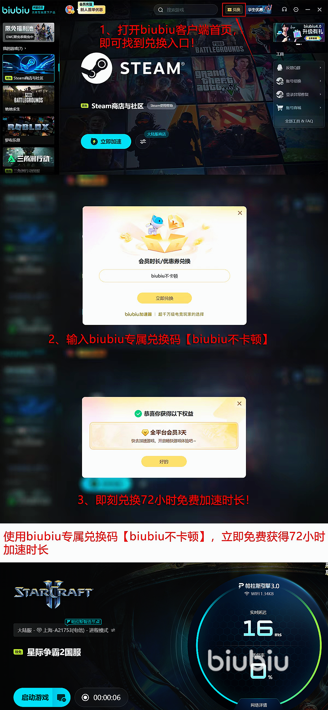 最后就是biubiu在升级性能的时候,也是对新用户优待的,只要是新用户首次注册biubiu都可以获得24小时免费加速,这个加速是不限制任何游戏以及路线的,使用兑换码【biubiu不卡顿】可获3天免费的使用权哦,也就是说能获得96小时的加速时间,老用户也是能领取的。