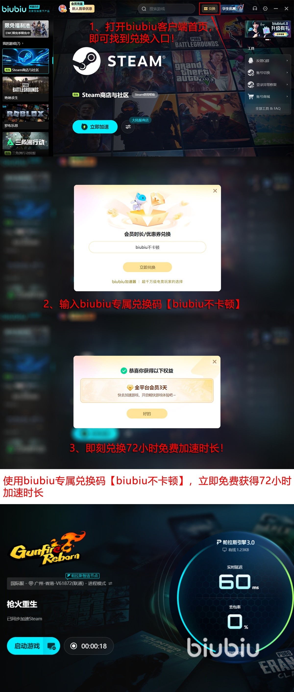 当然,各位玩家比较关心的充值问题在这里也不是问题,如果你是新用户,在首次注册之后是可以得到24小时免费加速的机会,使用完之后,新老用户还可以通过如下兑换码【biubiu不卡顿】再额外领取72小时加速时长,这样新玩家共计就会拥有96小时的超长使用时间,在此期间内,所有的游戏都可以一键体验,这下大家再也不用担心会出现浪费钱买到不适配加速器的问题了。