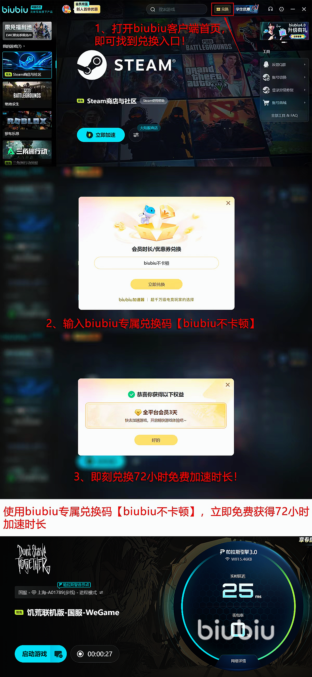 同时在性能不断提升的同时,福利这块自然也是不会遗忘的,所有新用户注册biubiu都可以获得24小时免费加速,加速期间是很多游戏都是支持的,使用兑换码【biubiu不卡顿】可获3天免费的使用权哦,一共可以获得96小时的时间,老用户也是能完全享受到的。