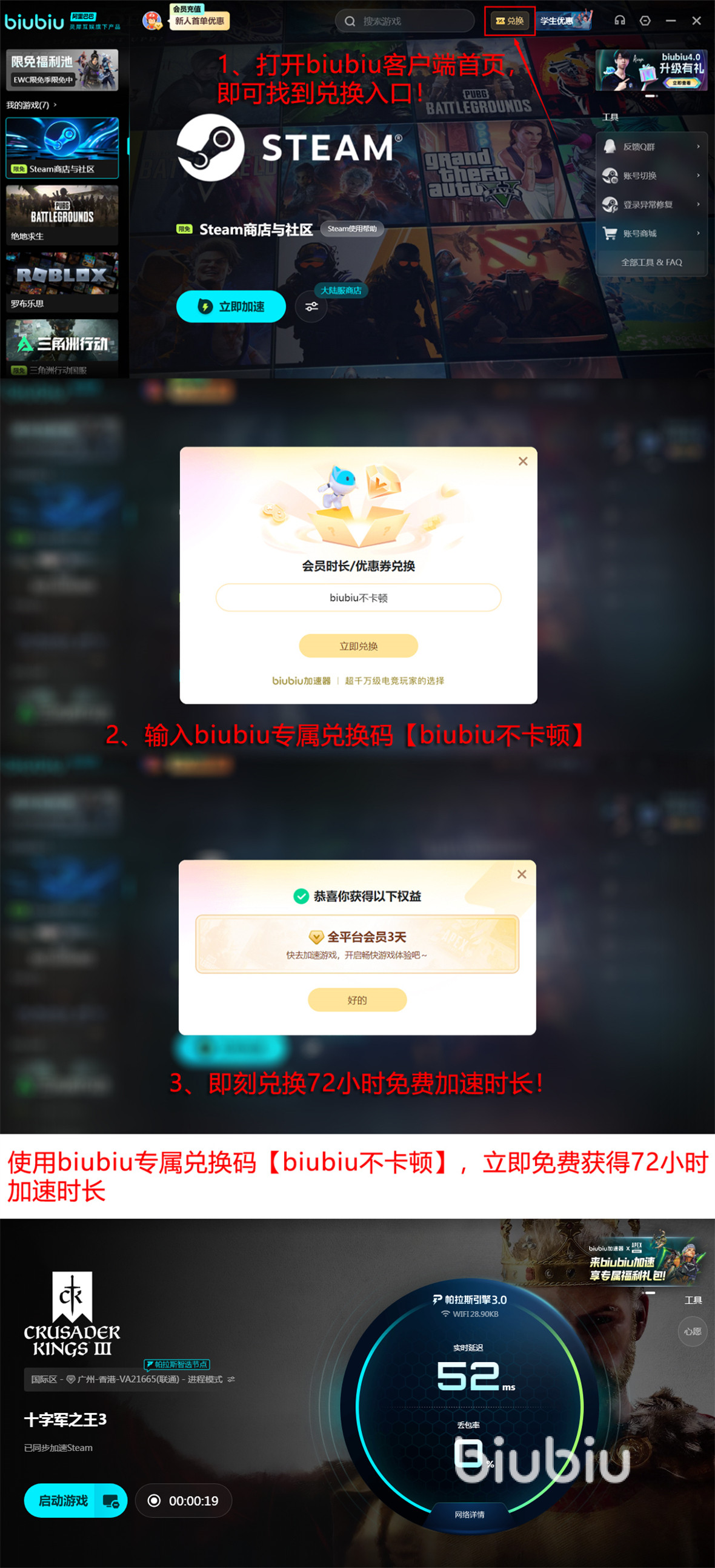 当前biubiu加速器面向新用户提供专属福利:注册即赠24小时免费加速时长;另附通用兑换码【biubiu不卡顿】,单账号限用一次,可额外激活72小时加速服务。两者叠加可获得总计96小时无门槛使用权益,覆盖完整新手适应周期。