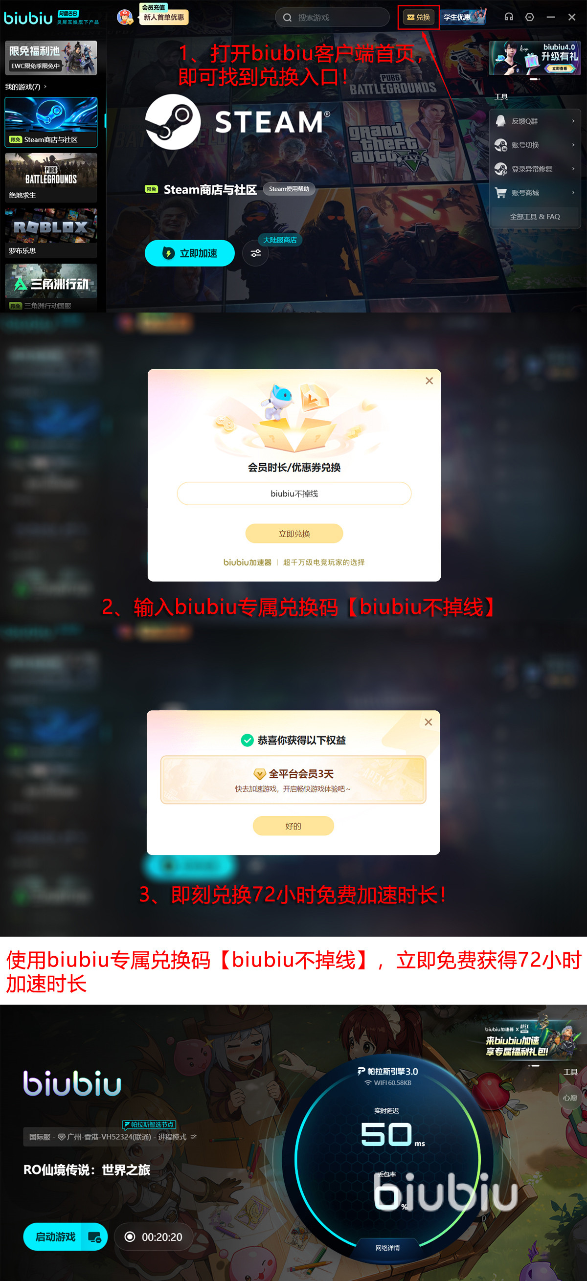 针对新玩家,biubiu加速器同步推出专属入门权益:完成注册后即可免费体验首日24小时极速加速服务;输入激活码【biubiu不掉线】,还可额外解锁72小时全功能畅玩权限;两项叠加后,新人最高可享连续4天的无门槛免费加速体验。