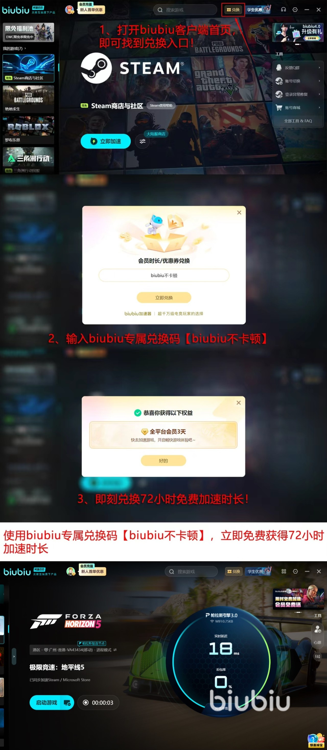 对于正被启动问题困扰的玩家来说,现在正式亲身体验biubiu的好时候,新用户注册成功后即可拥有24小时的试用时间,足够你开车跑好几圈了,而且平台还提供了【biubiu不卡顿】这个兑换码,用它就能领取3天的加速时间,而且适用于每一名用户,可以说是诚意满满。