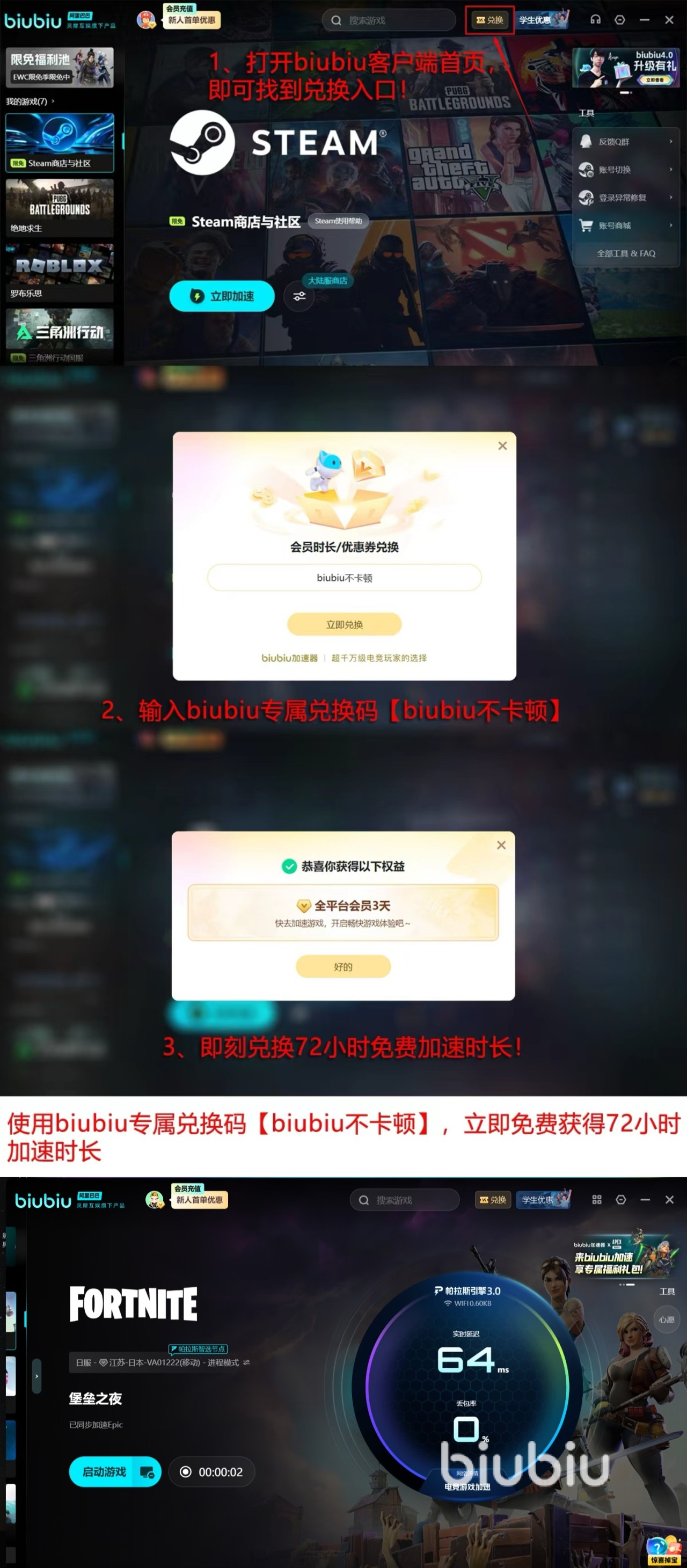 不过软件到底适不适合自己,还是要试过才知道,恰巧biubiu官方为刚完成注册的新用户,提供了免费的24小时试用时间,以便于你去体验软件的各项功能。要是24小时不够用,你还能使用【biubiu不卡顿】这个所有用户都适用的兑换码去领3天时间,然后接着去体验。