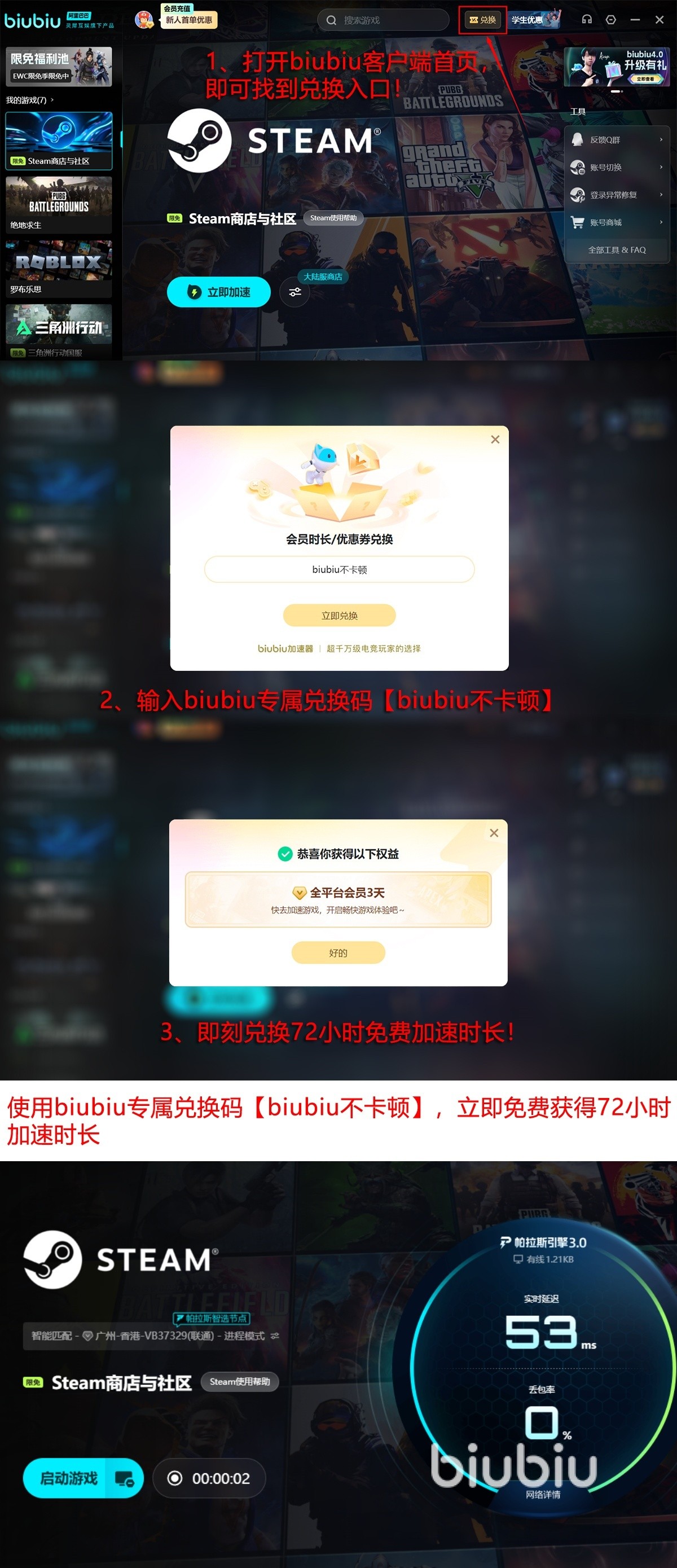 如果是新手玩家,担心平台不符合自己的加速需求完全没有关系,biubiu对于新老用户也是赠送了超多福利,如果是首次注册账号,那么我们可直接获得24小时免费加速的权益。在此期间,所有平台的游戏都是可以一键加速的。另外全部账号也可以借助专属兑换码【biubiu不卡顿】再额外领取3天的免费使用权限,这样新手玩家最多就拥有96小时的免费体验机会,能够全方位的了解平台的实用性,再决定自己后续是否要继续使用。