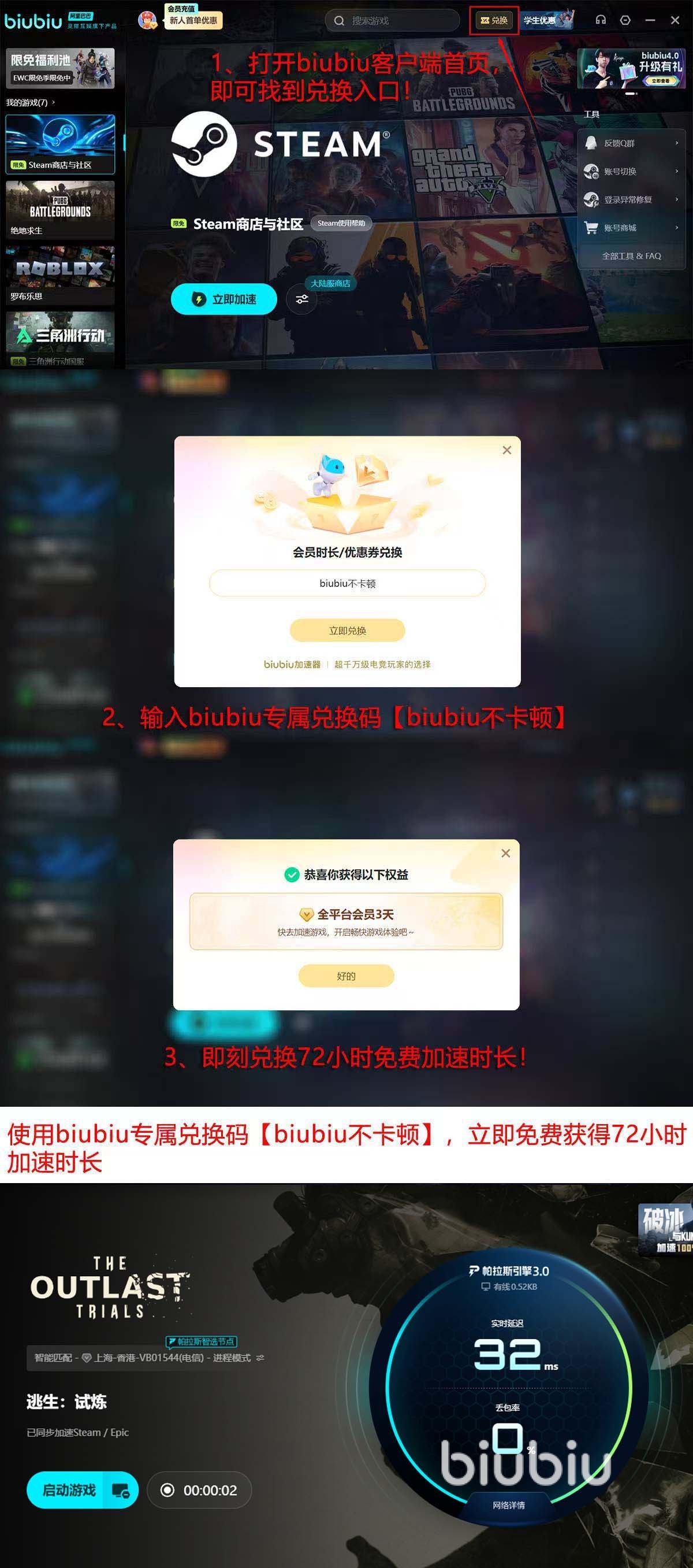 作为一个恐怖游戏,图画流畅不延迟,现在还能领免费时间,大家畅快体验到游戏被加速后的乐趣。有2个免费时间,一个是在注册新账号时,客户端系统在后台直接送的24小时的新手福利 ,另一个是,成功后登录客户端上,打开上面的“兑换”,用口令【biubiu不卡顿】兑换领取到72小时的口令福利,当然,两个活动时间叠加后就有96小时。