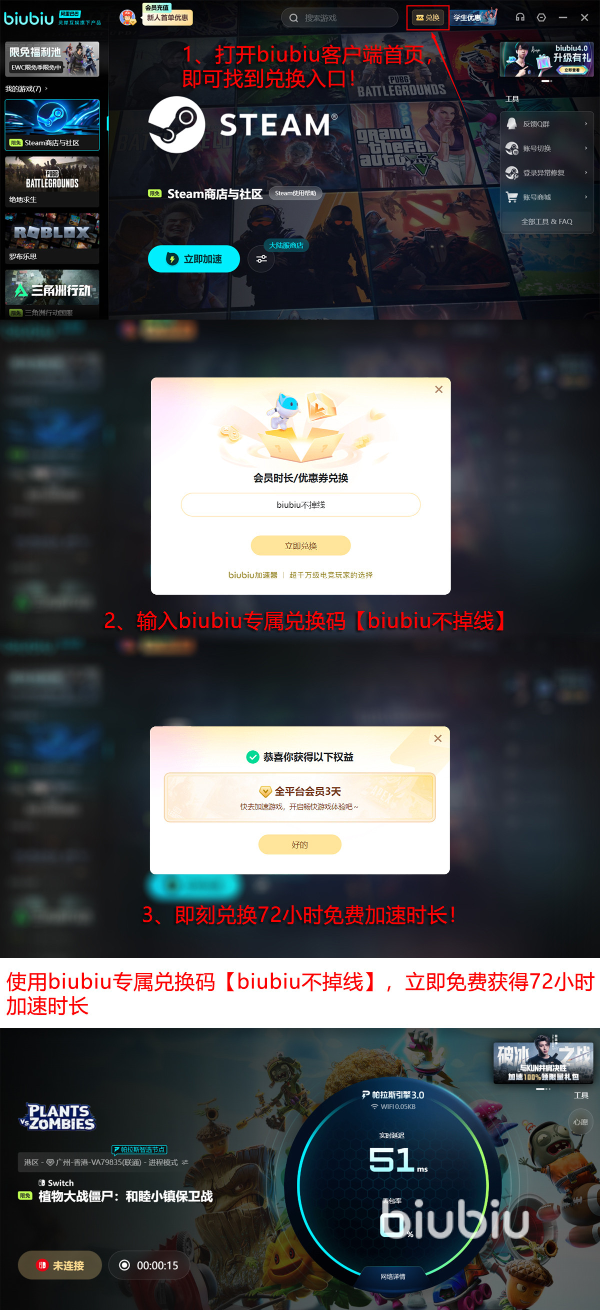 凡是刚认识biubiu的小伙伴,都能获取大量奖励,只要注册账号然后完成登录步骤,就可得到免费的24h服务时间,其次有【biubiu不掉线】这个兑换码在开放当中,拿去的人都能换到72h加速权益用,新人综合能得的福利是有96h的。