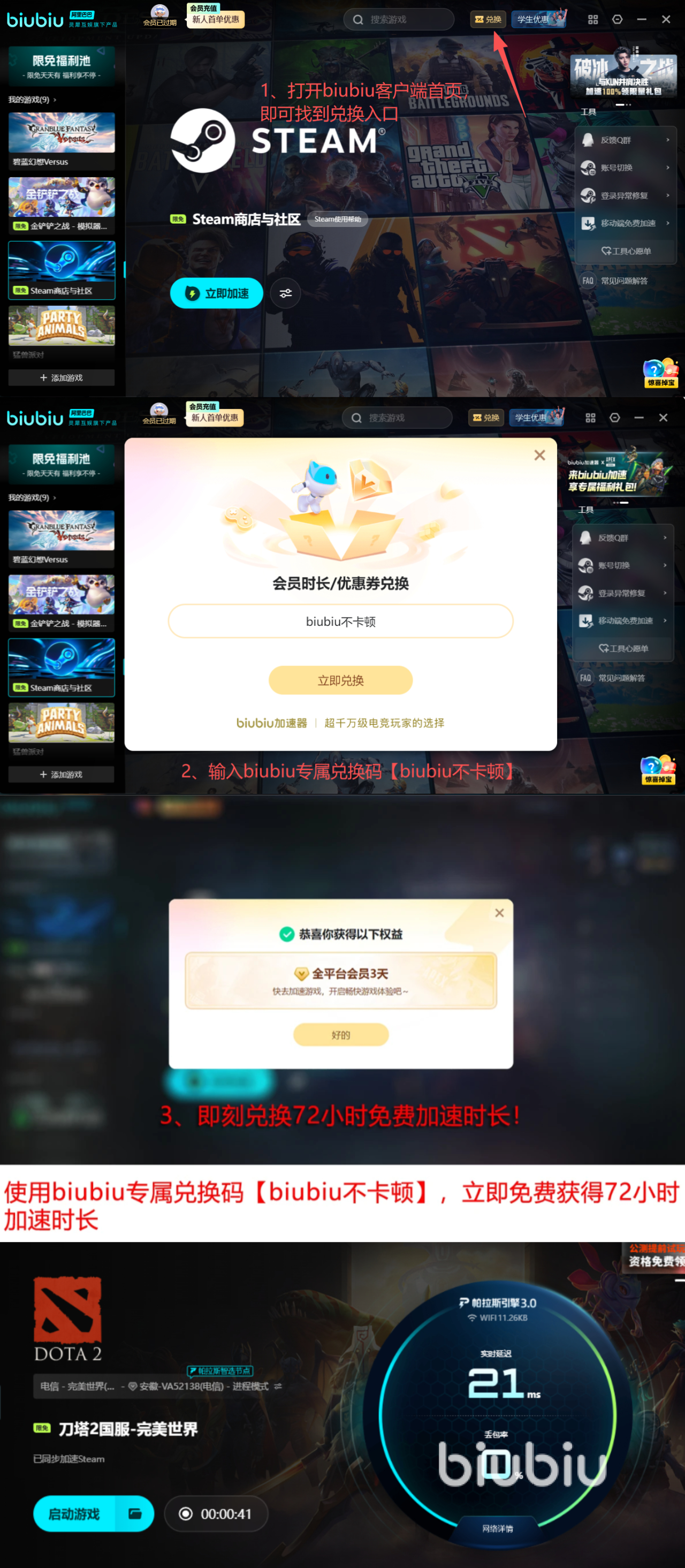 biubiu加速器推出限时新人福利,这意味着现在正是体验职业级网络良机。注册就赠送24小时无门槛加速服务,输入专属口令【biubiu不卡顿】,能够再额外领取72小时加速时长,一共能享受到96小时优质加速时长!足够支持三人小队进行多轮深度实战,彻底告别连接失败困扰。96小时免费加速已就绪,让每一次切入与控制都精准无忧!