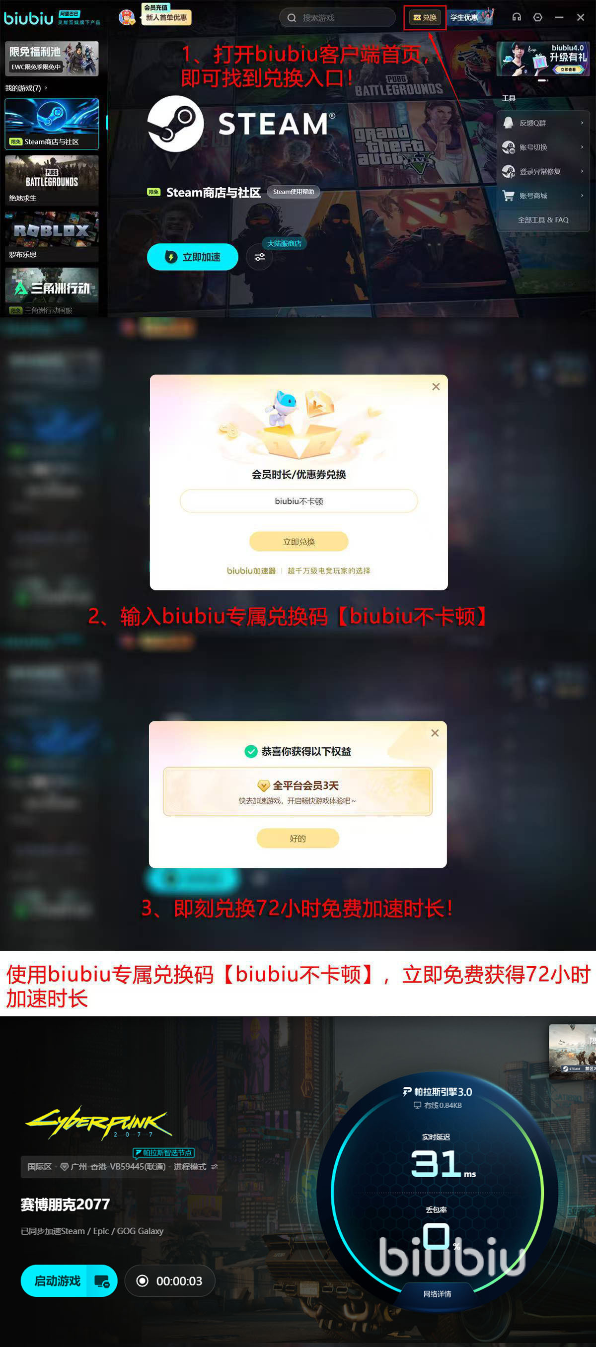 看了小编说了这么多,相信不少小伙伴,一定想试一下,不要急,这里还有福利要送给各位,目前官方有两个福利可以领取,第一个是注册福利,大家注册了新账号之后,就可以看到账号被加了会员记号,这是因为注册时系统直接给大家送了24小时福利时间,另外一个是手动领取的,只需要把口令【biubiu不卡顿】,粘贴或者复制到,被点开的首页“兑换”对话框里,点击确定后就能有72小时,账号后台可以查询到 ,一般领取后个人总时间是96小时,因此注册后就赶紧领取吧。