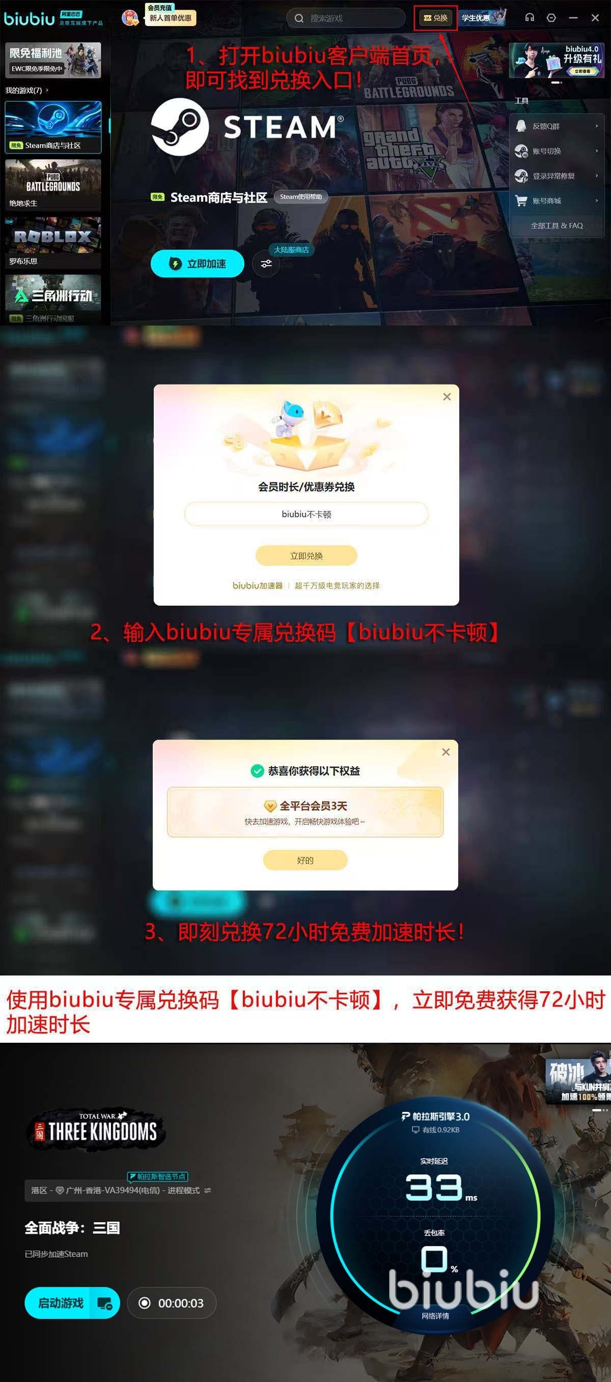 实际使用反馈显示,启用biubiu加速器后,《全面战争:三国》在Epic平台的平均连接成功率提升至99.2%,闪退率下降约87%。对于尚未尝试的用户,平台提供分阶段免费体验权益:新注册账号即时获得24小时使用权;登录客户端后,在首页点击“兑换”,输入口令【biubiu不卡顿】,即可追加72小时服务时长,累计达96小时(即4天)。