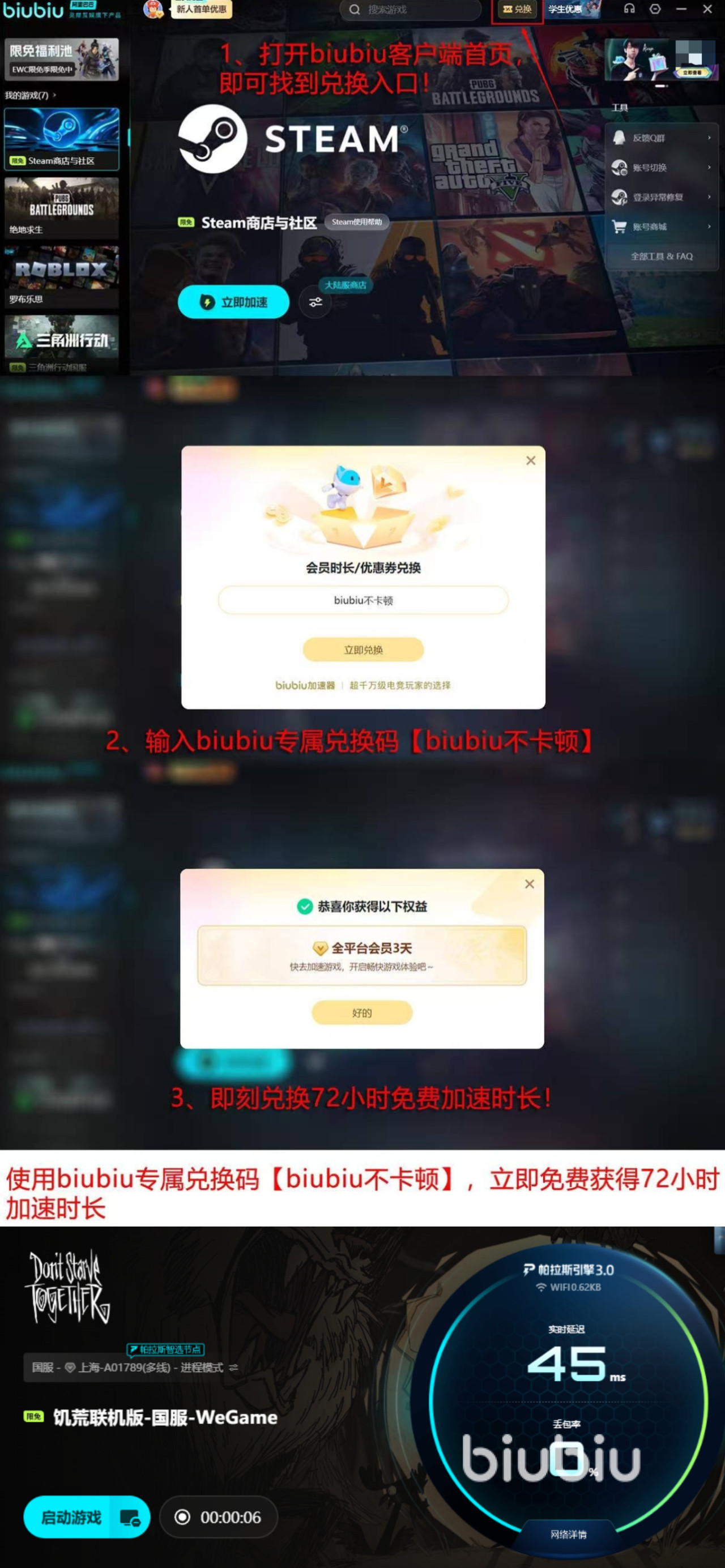 新用户注册即赠24小时全功能试用权限,无需额外操作即可激活。此外,平台面向全体用户统一发放叠加型体验福利:输入指定口令【biubiu不卡顿】,即可额外获得连续三天加速时长,新老用户各限领取一次,有效期自兑换成功起自动计时。