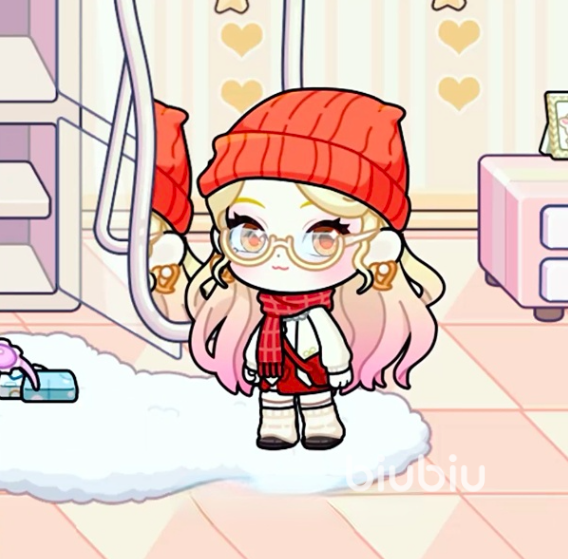 第二套聚焦红系视觉张力:渐变粉发色搭配橘黄色美瞳增强眼部表现;内搭白色基础款毛衣,外穿带有刺绣工艺的红色外套;下装为红色短裙,足部采用黑色皮鞋与堆堆袜组合;围巾与斜挎包均延续红色主调;头部可选橘色冷帽提升保暖性与造型完整度,兼顾实用性与风格表达。