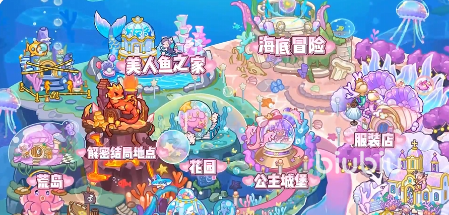 游戏首发测试阶段已开放首个完整世界地图,涵盖海底冒险、美人鱼之家、花园、公主城堡、服装店、海盗餐馆等十余个可进入场景。每个地点均具备独立空间结构与功能定位,玩家点击对应图标即可瞬移抵达,实现无缝切换。