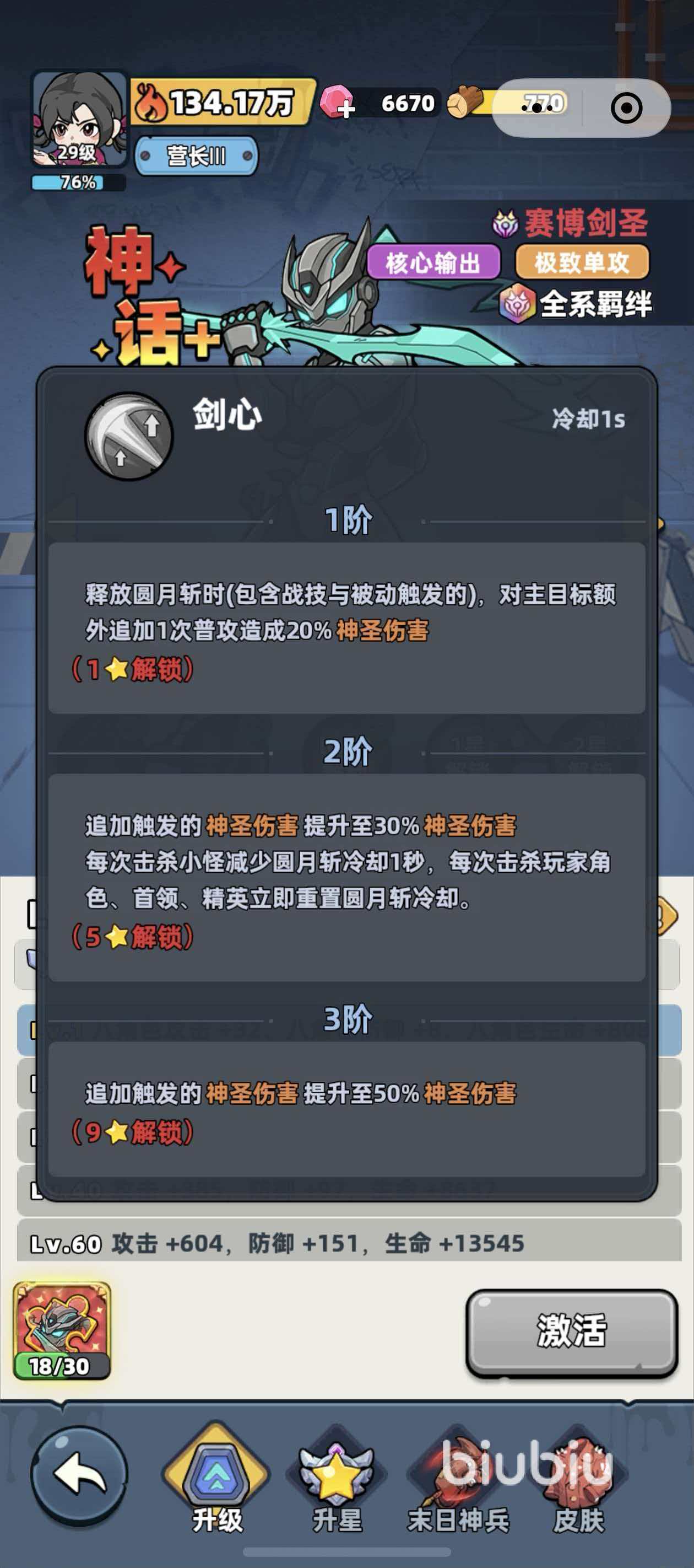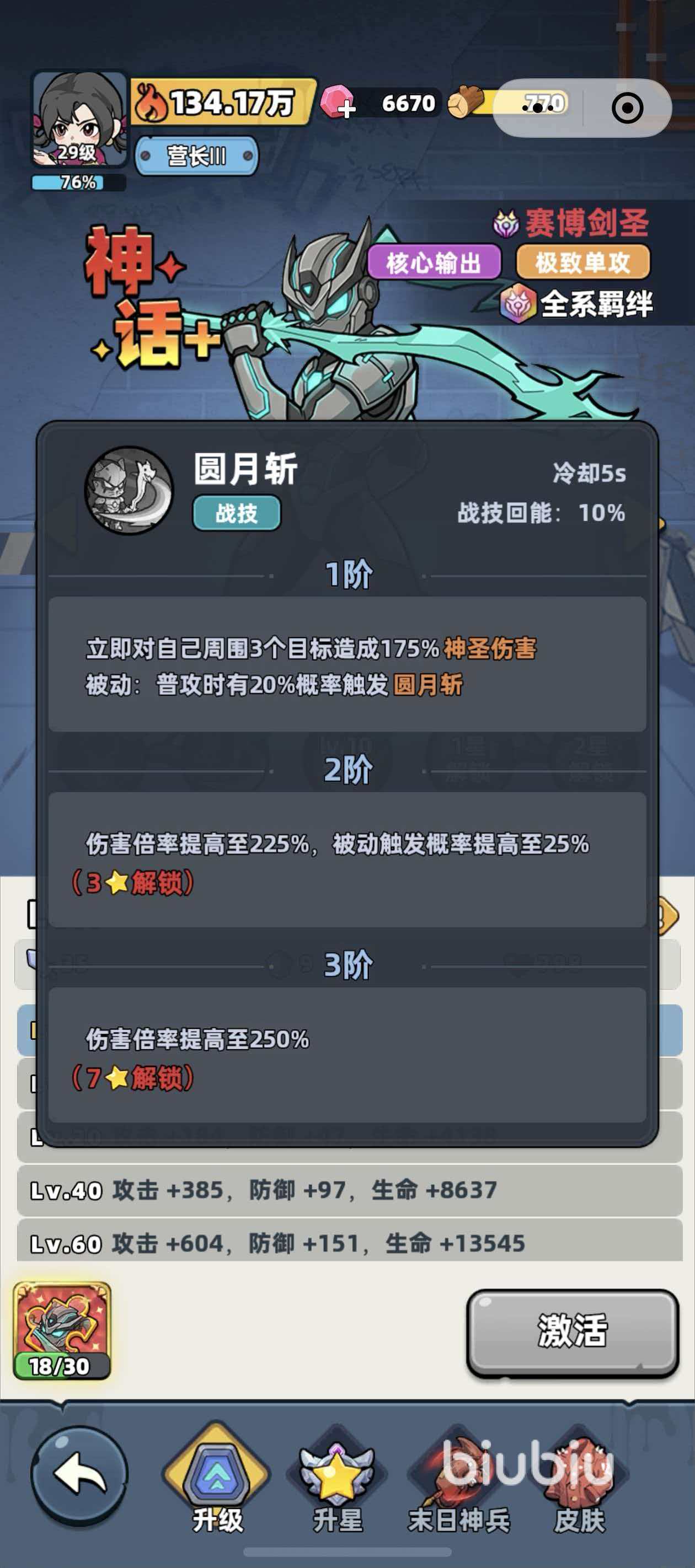 核心技能机制围绕高频连击展开:“圆月斩”为范围物理攻击技能,释放时对周围3名敌方单位造成175%神圣伤害;“剑心”则作为协同技,在使用圆月斩或其他战技后,自动追加一次普攻,额外造成20%神圣伤害。二者叠加可形成稳定的多段打击节奏,契合高频率输出逻辑。