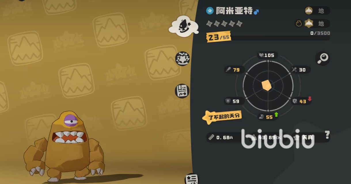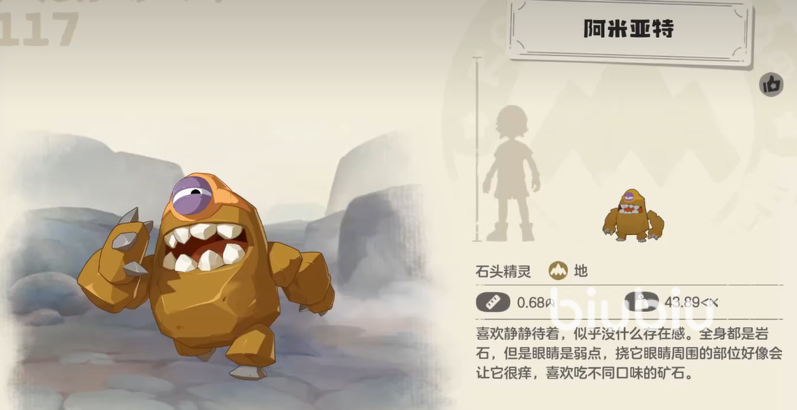 阿米亚特外形以厚重岩甲为显著特征,全身覆盖致密岩石结构,视觉上凸显其高耐久属性。值得注意的是,其眼部区域未被岩石完全包裹,构成战斗中的相对弱点。根据游戏设定,该精灵长期栖息于干旱高温的沙漠环境,其体表岩层正是为适应极端气候而演化出的生存形态。