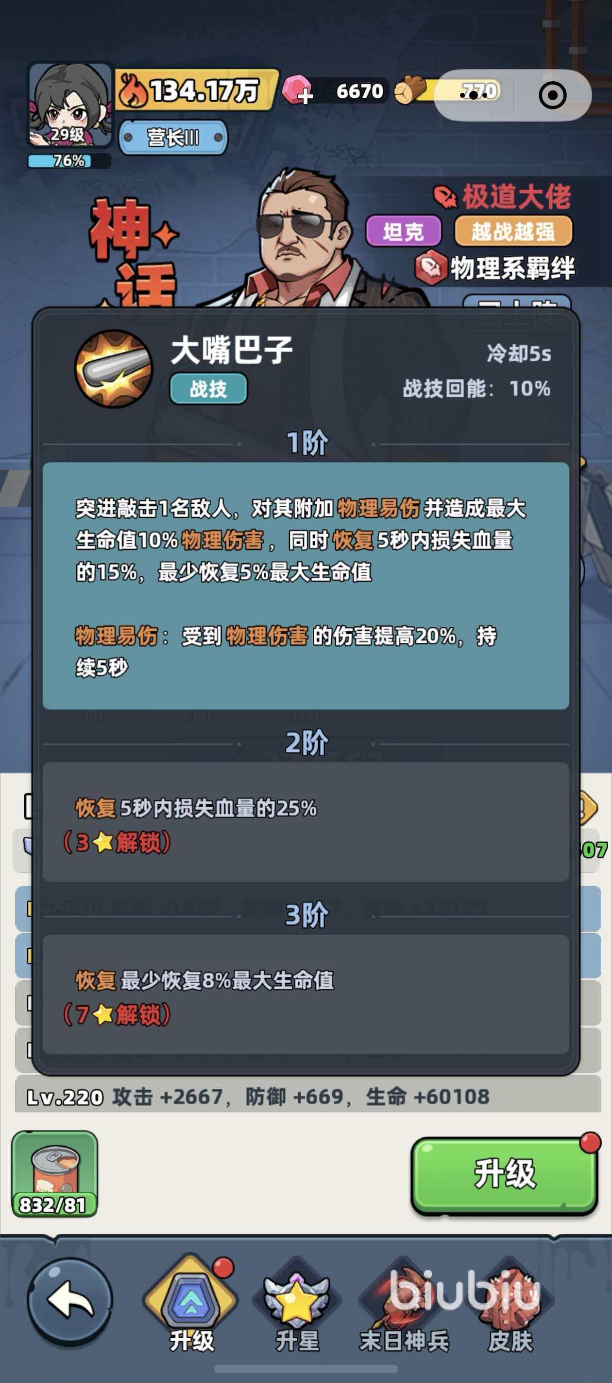 主动技能“大嘴巴子”兼具突进、控场与增益功能:成功命中后,为目标施加物理易伤,造成相当于其最大生命值10%的物理伤害,并使其在5秒内持续损失15%当前生命值;与此同时,极道大佬自身恢复5%最大生命值。另一关键技能“硬汉”消耗30%当前生命值,立即获得1层硬汉效果,每层提供5%伤害减免,持续5秒,最多叠加10层。两项技能均支持升阶——升至2阶后,效果全面强化,例如“硬汉”的生命消耗比例由30%降至20%,实用性大幅提升。