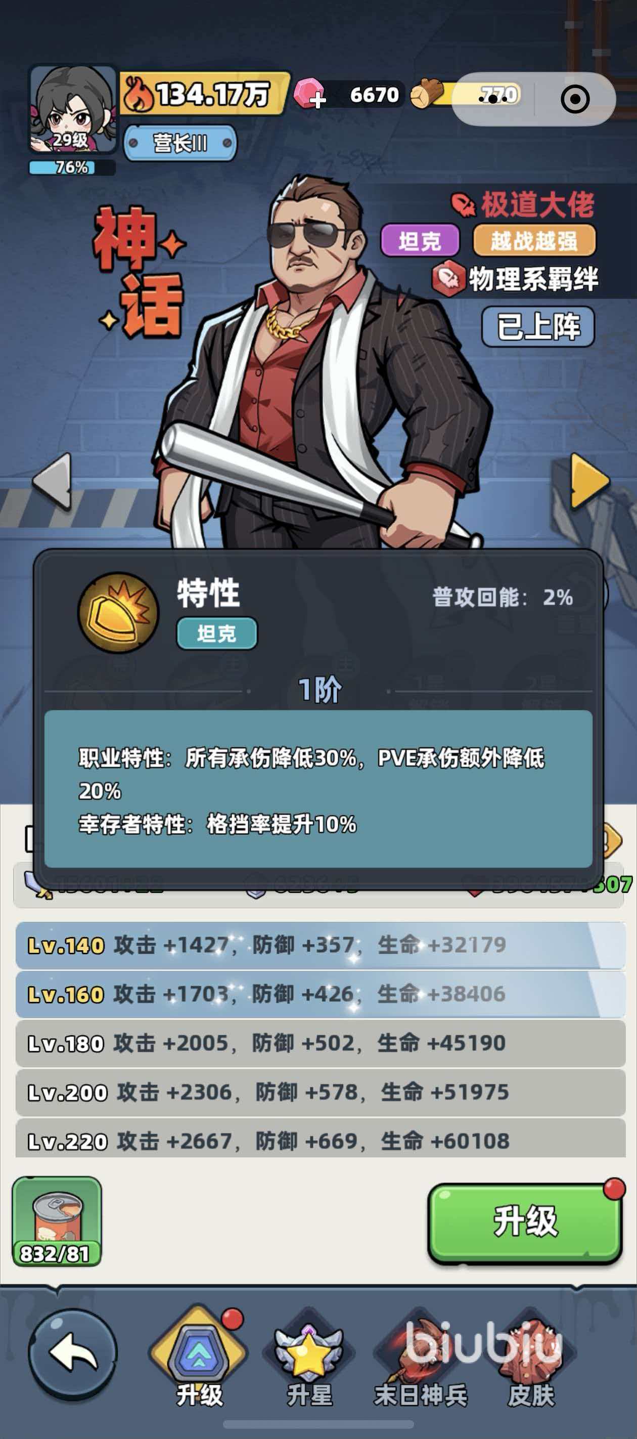 极道大佬定位为成长型坦克,具备典型的“越战越强”机制。其基础属性即提供30%所受伤害减免;在PVE副本中,该减伤效果额外提升至50%(基础30%+PVE专属20%)。同时,他拥有10%特当率加成,并可通过核心技能使目标进入物理易伤状态,且该易伤效果可多层叠加,显著放大队伍中物理输出角色的实战伤害。