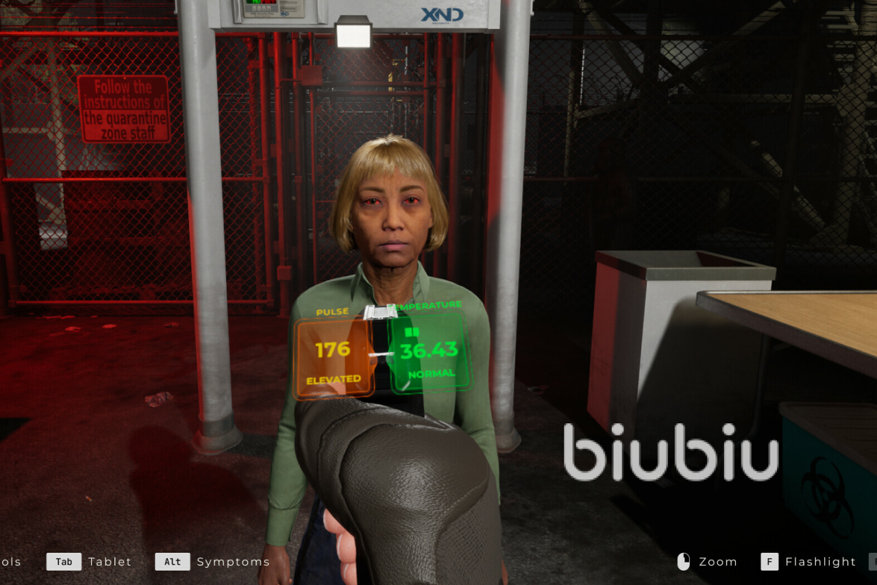 游戏内容上你需要对过关者进行检查,是否有伤口或者呼吸异常,体温枪还可以查看体温是否正常,然后还要检查携带的包裹是否有违禁品,如果发现感染者可以直接当场击毙,不太确定的是否是丧尸的你需要将对方暂时隔离,第二天再去查看是否有异变,有异变直接击毙,是不是十分紧张刺激。