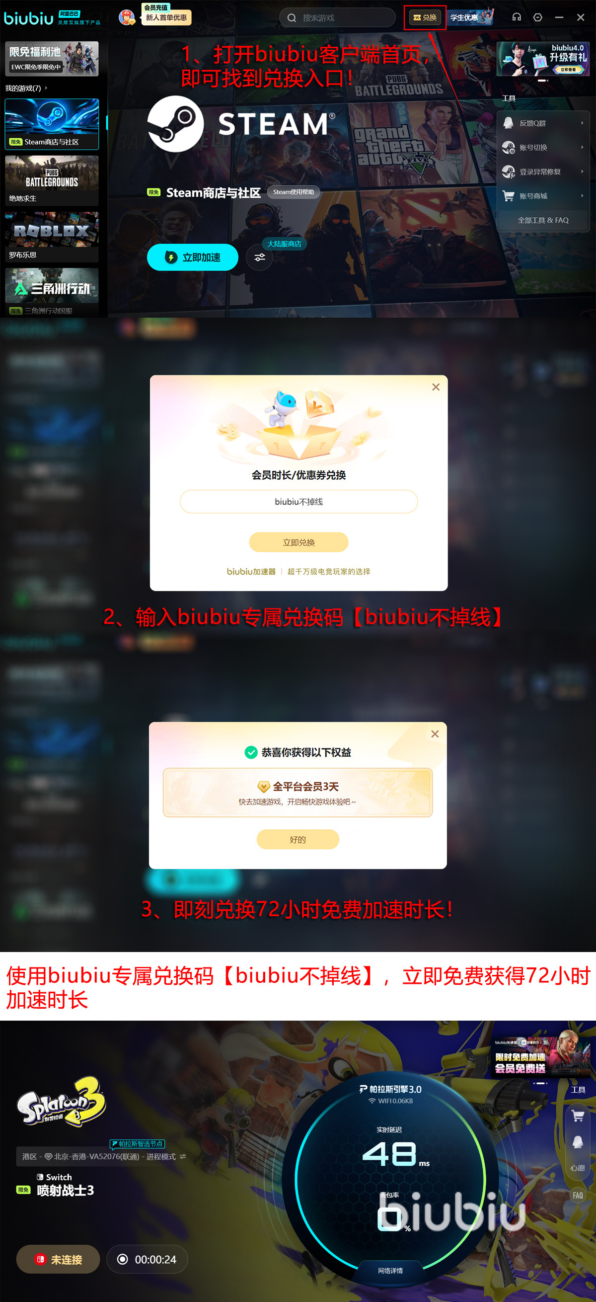 现在的福利挺实在的:只用输入【biubiu不掉线】直接领走3天免费时长,注册成功再送24小时。全算下来总共能拿到96小时。