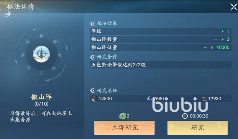 次选【搬山阵】——高效资源采集类秘法。地图中分布大量基础与稀有资源节点,手动采集效率低下。该秘法可显著提升单次采集量与单位时间采集次数,且支持等级提升至10级;满级后不仅采集速率跃升,更可解锁高阶资源的采集权限,为炼丹、炼器、筑基等后期养成提供稳定物资保障。